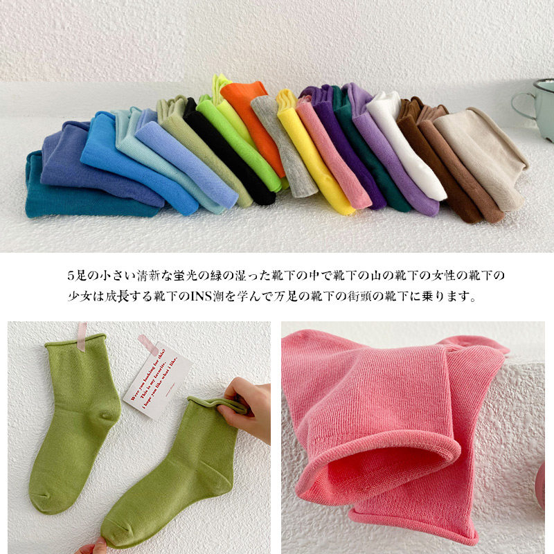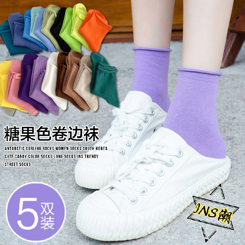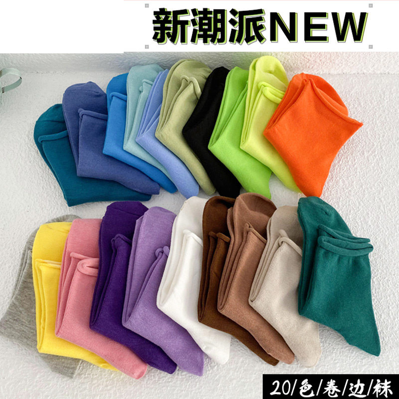 彩色袜子女中筒袜秋冬多巴胺卷边堆堆袜糖果色棉袜吸汗透气女袜