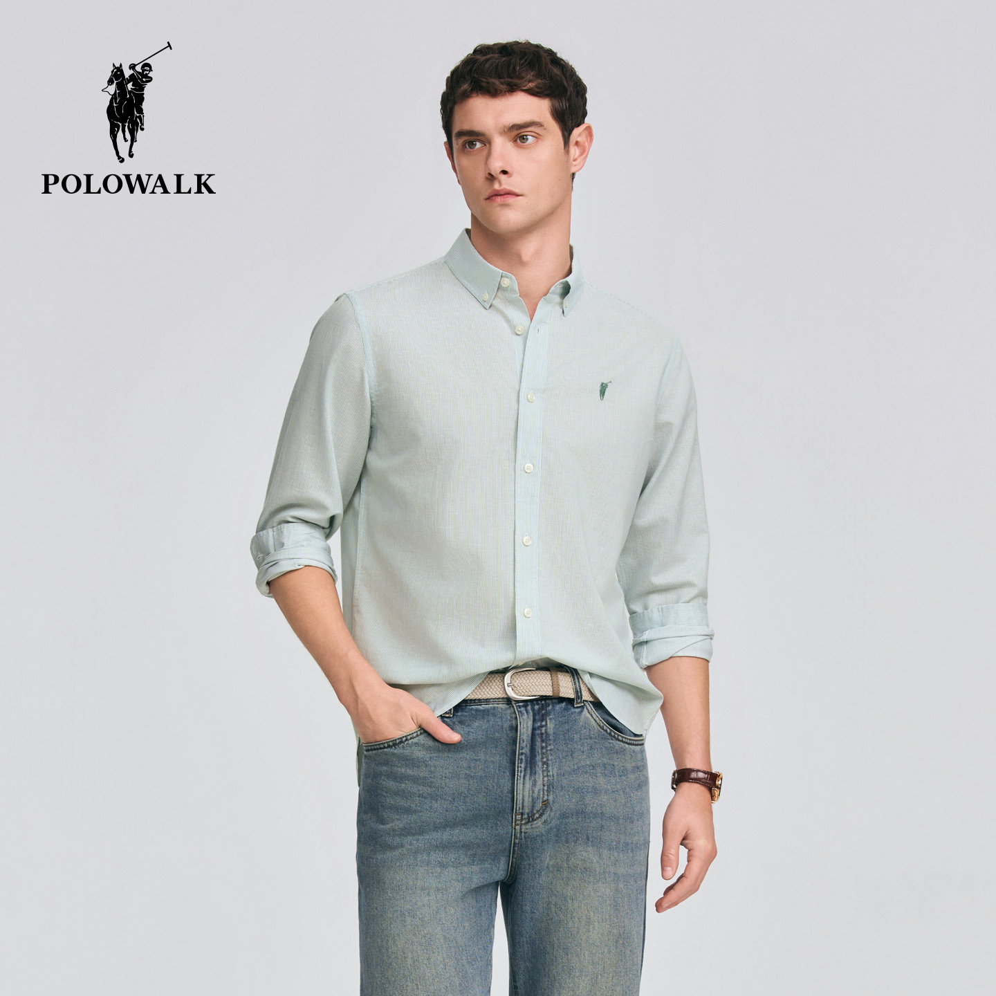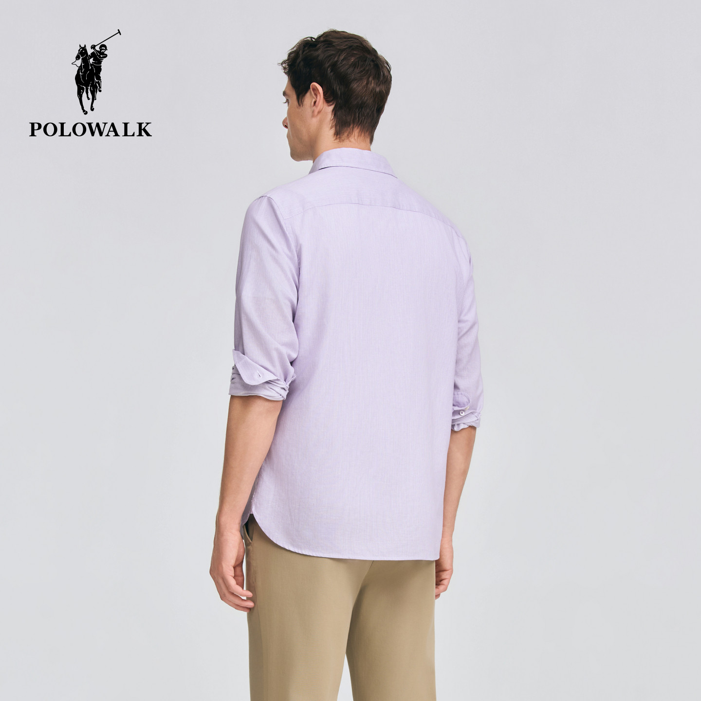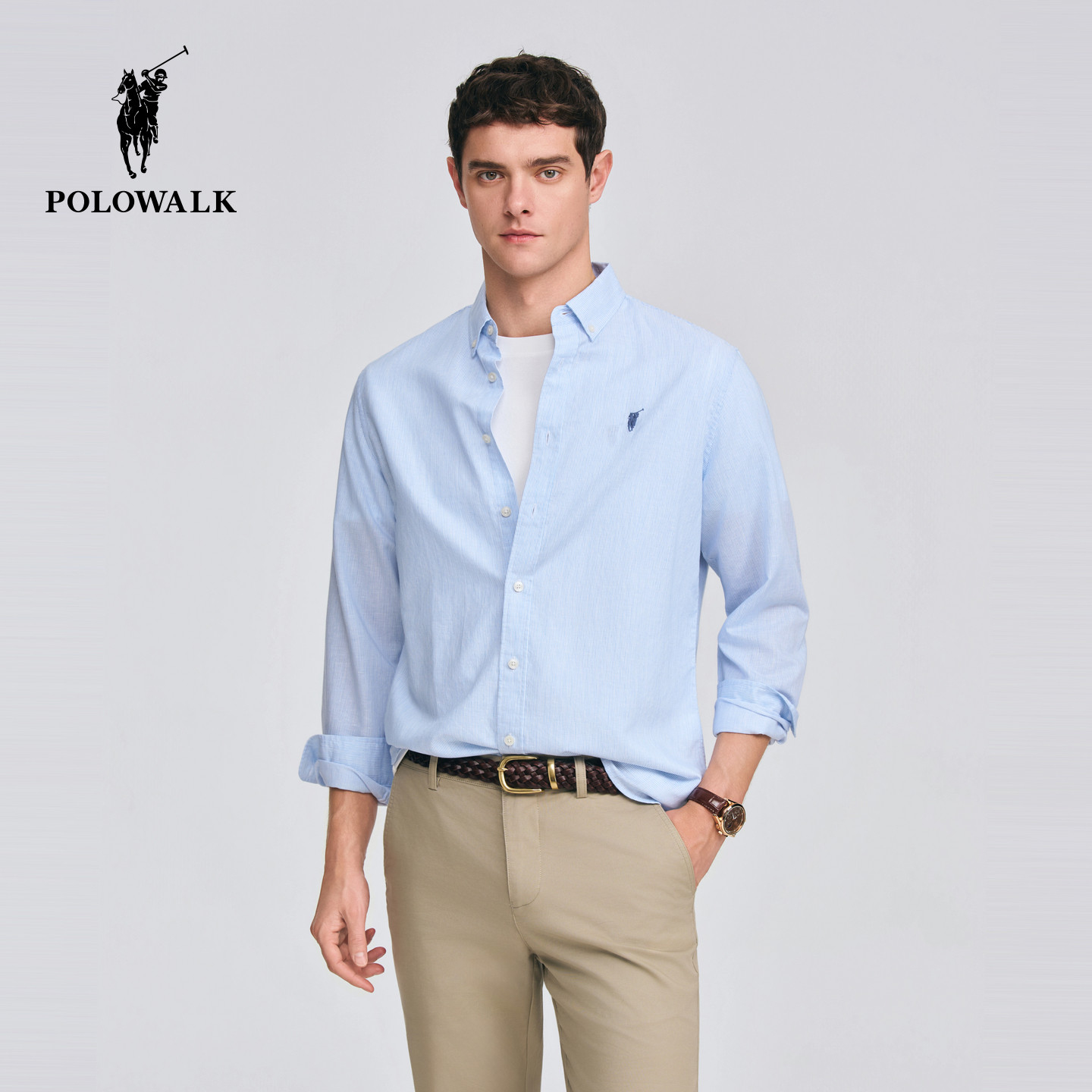 长袖 亚麻混纺纽扣领细条纹通勤衬衫 衬衫 新品 2026春季 POLOWALK男式