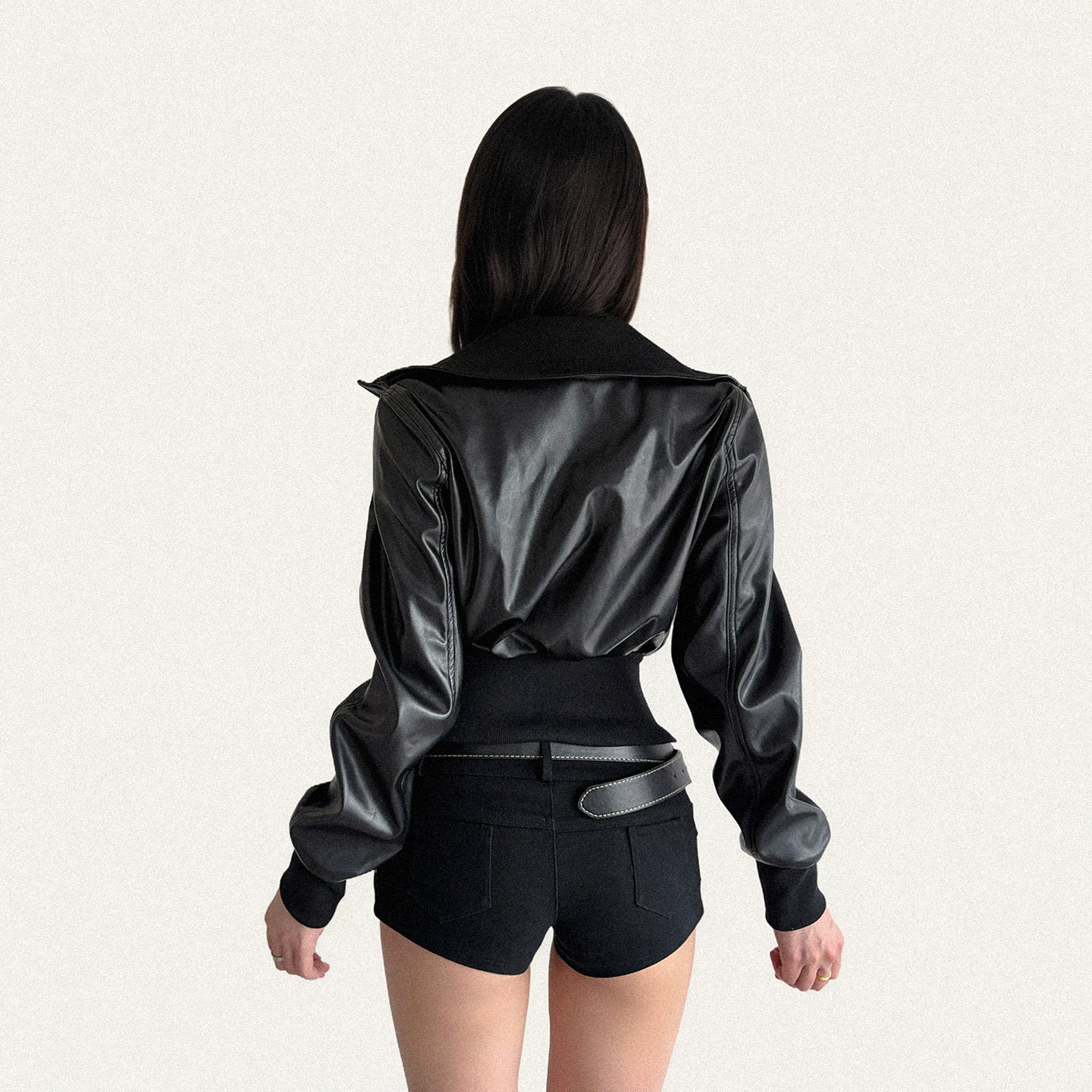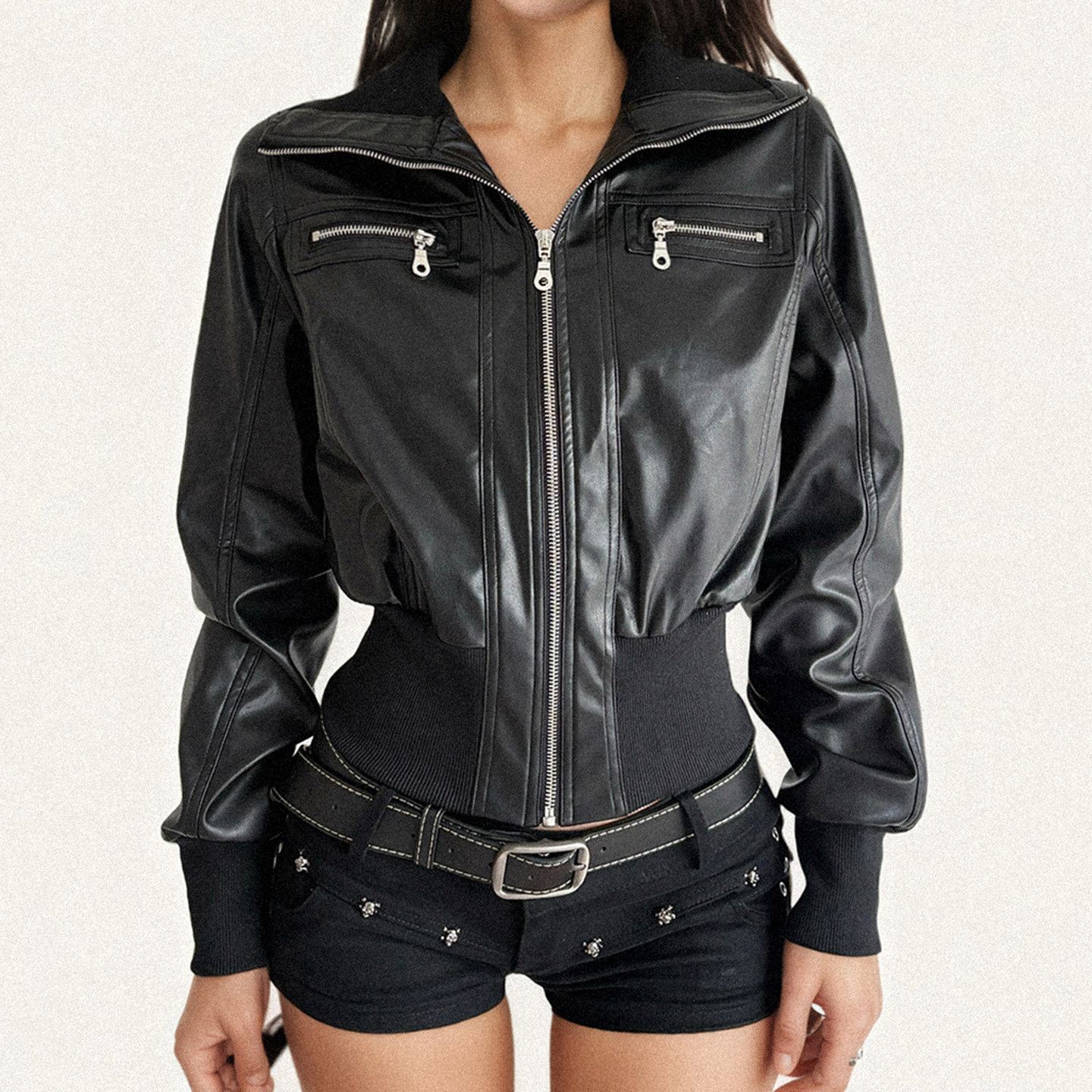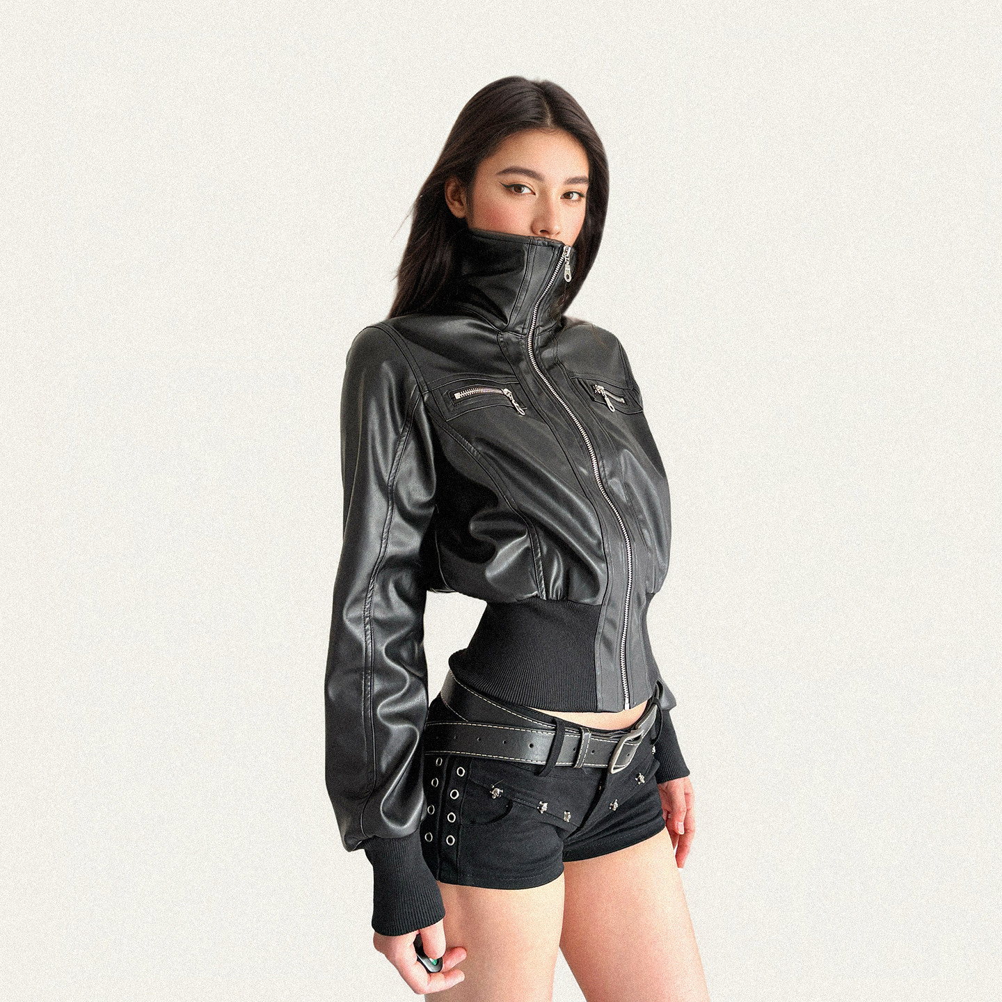 FUNOFF 复古黑色拉链立领皮衣夹克秋街头机能收腰短外套上衣 美式