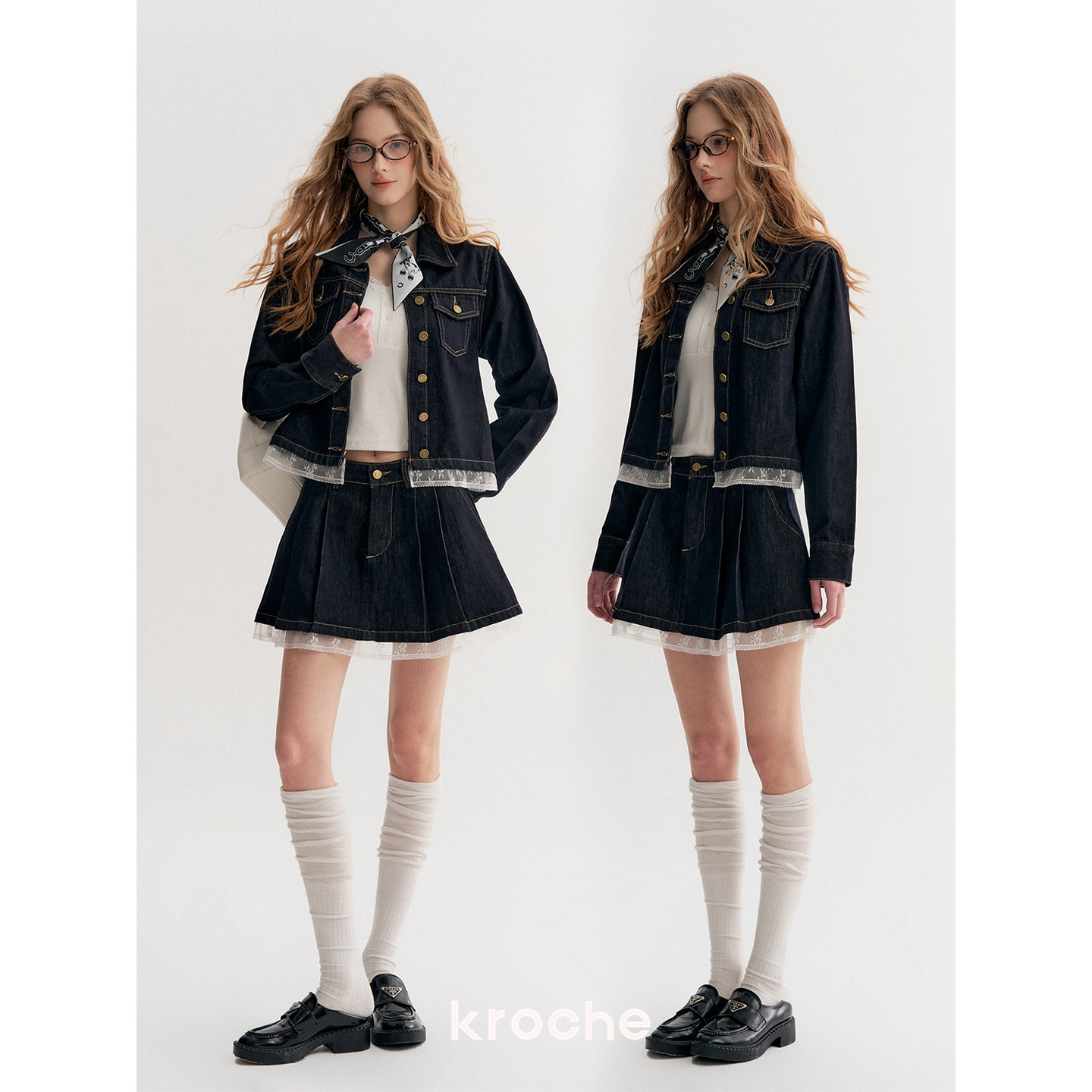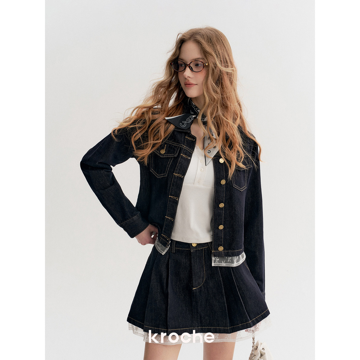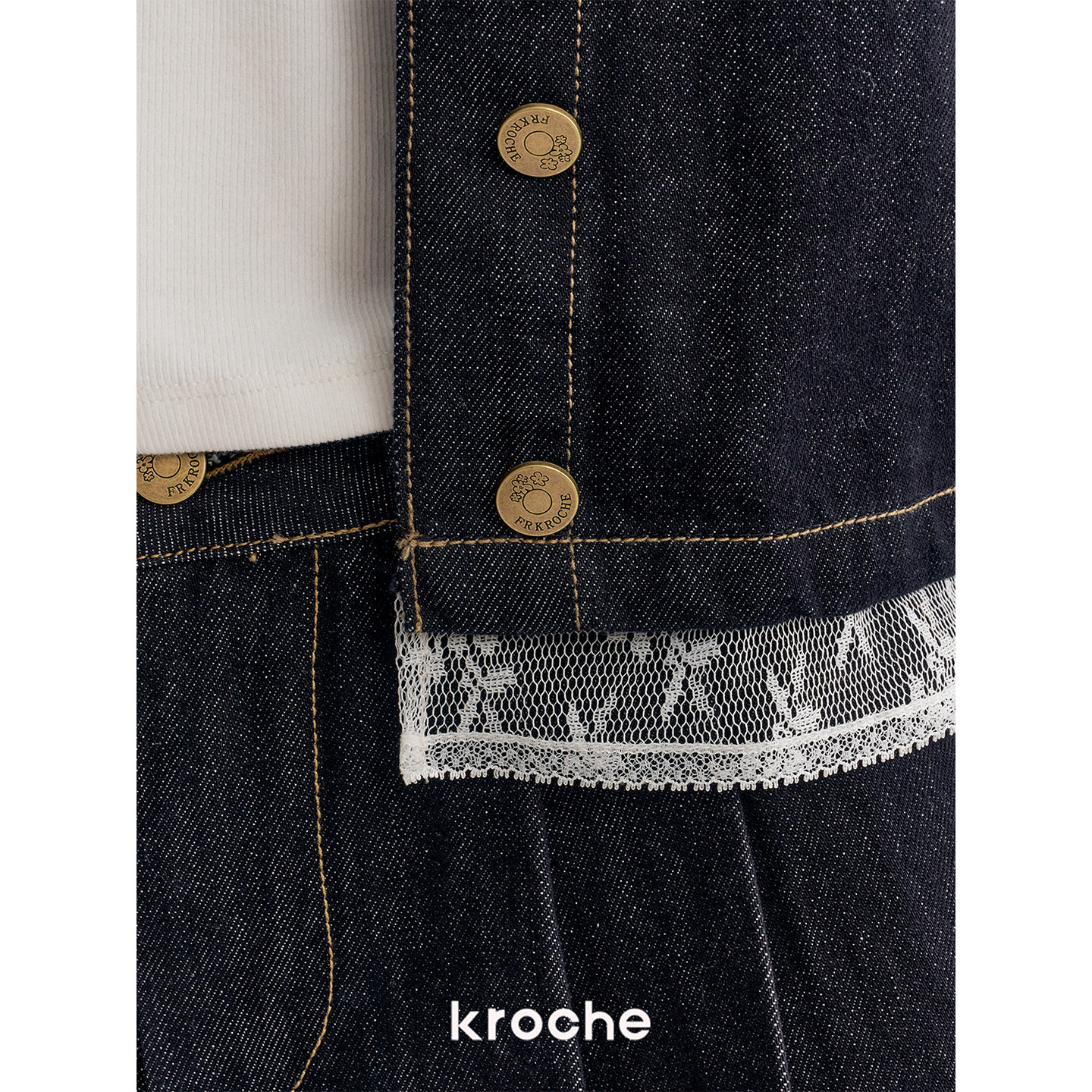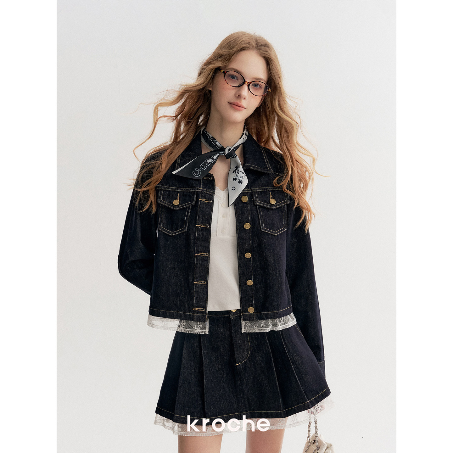 Kroche 蕾丝拼接下摆短牛仔外套A字半裙两件套 慵懒浪漫