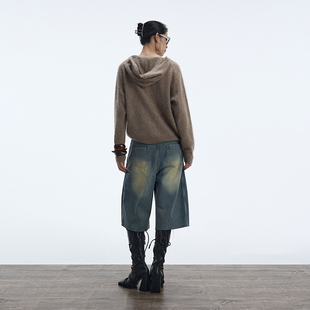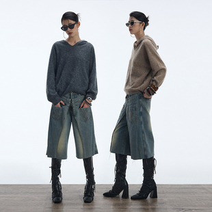 女秋设计感短裤 ourhour 门襟拉链五分牛仔中裤 两片式 复古做旧蓝