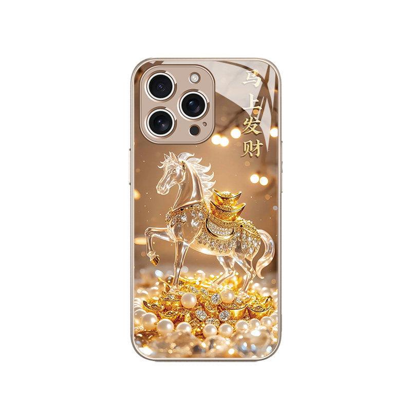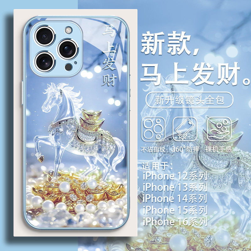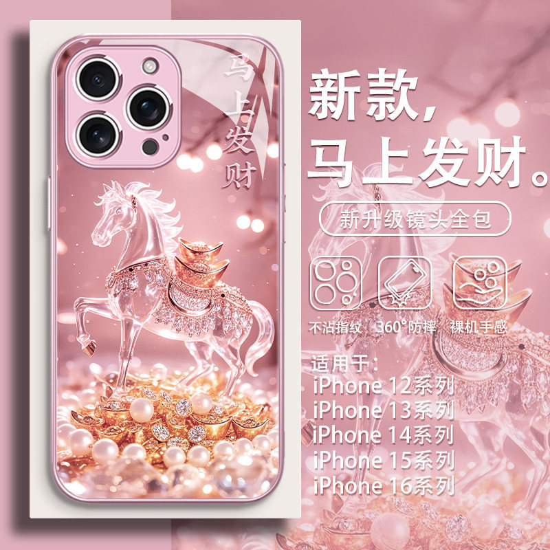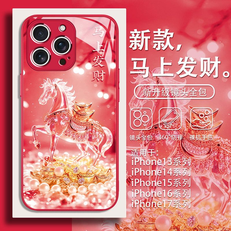 马上发财适用苹果17手机壳16promax新年款 xr马年11招财8暴富 iPhone15国潮14plus高级感13玻璃12mini本命年xs