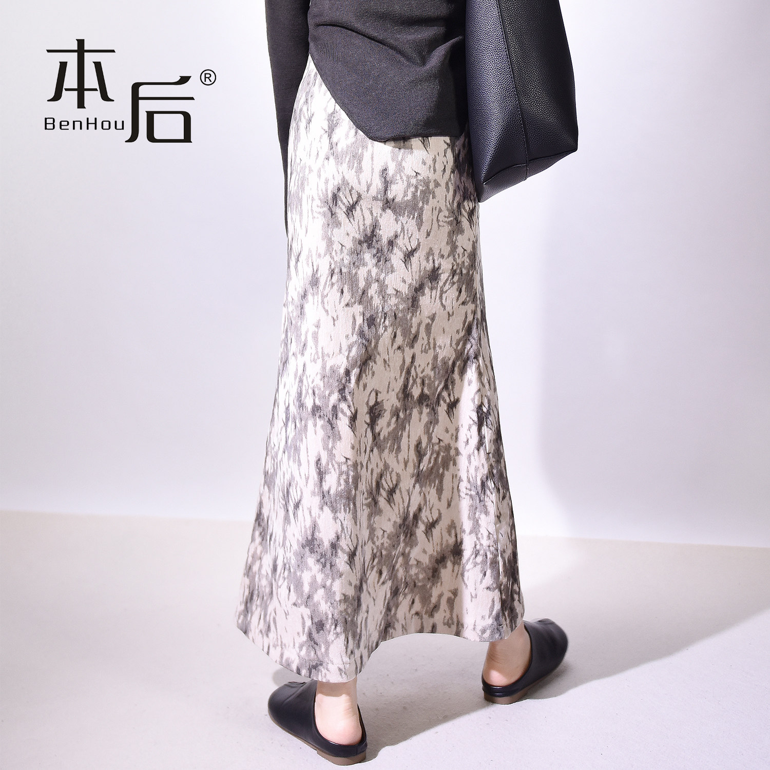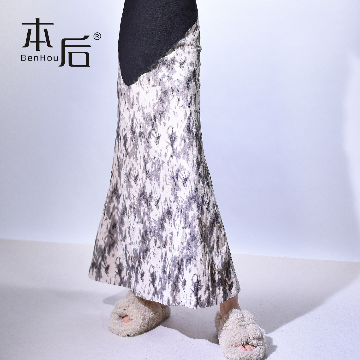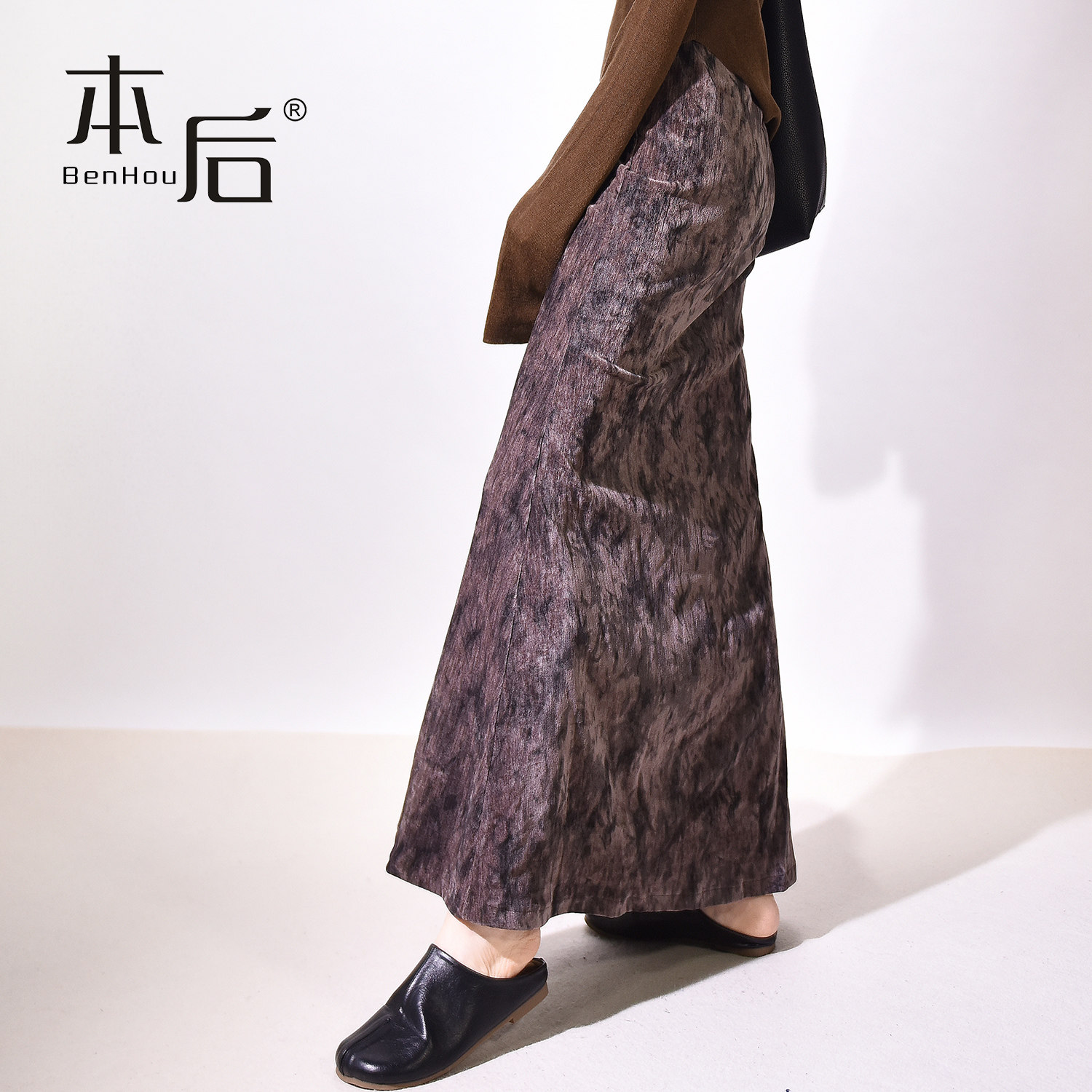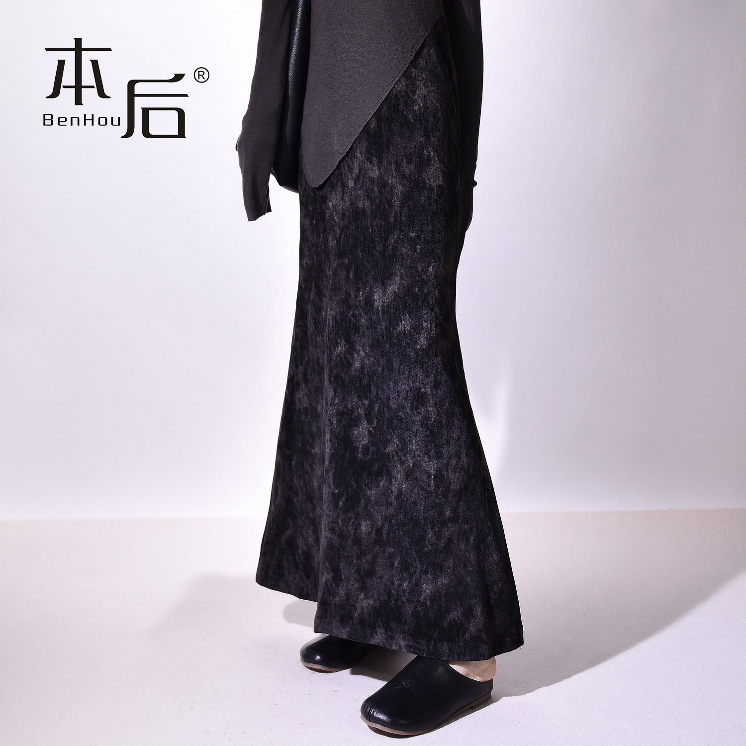 复古丝绒晕染鱼尾半身裙女秋冬高腰气质长裙子 2456 BenHou 本后