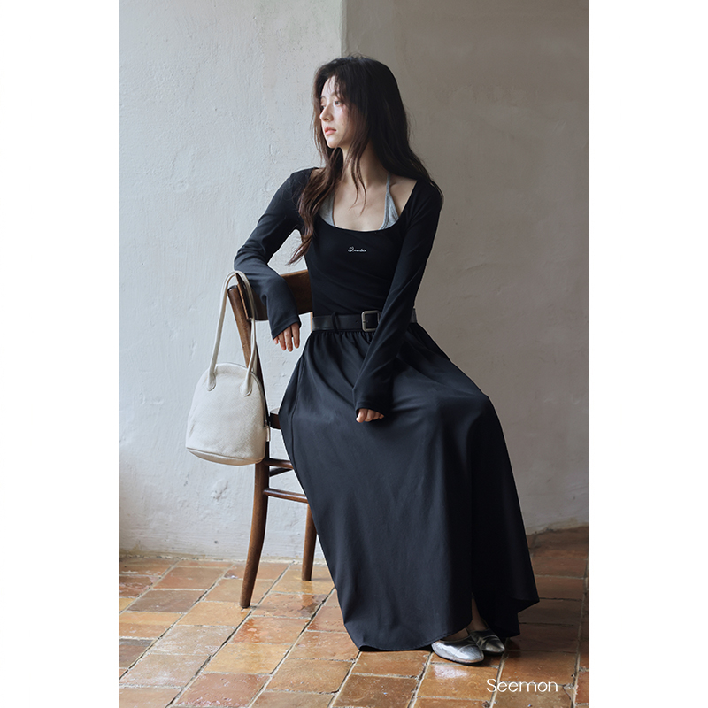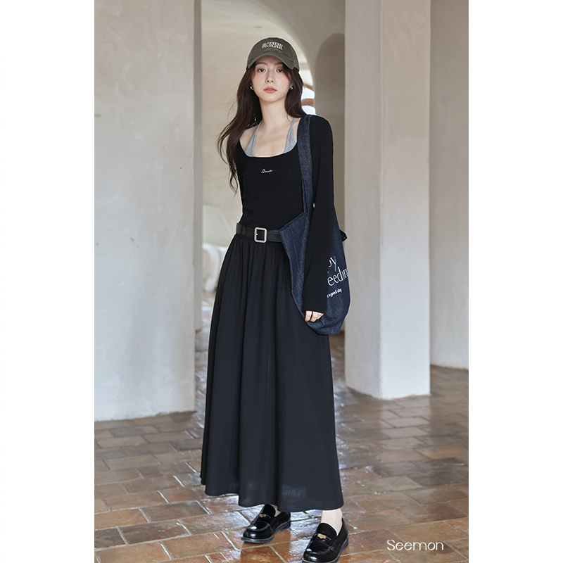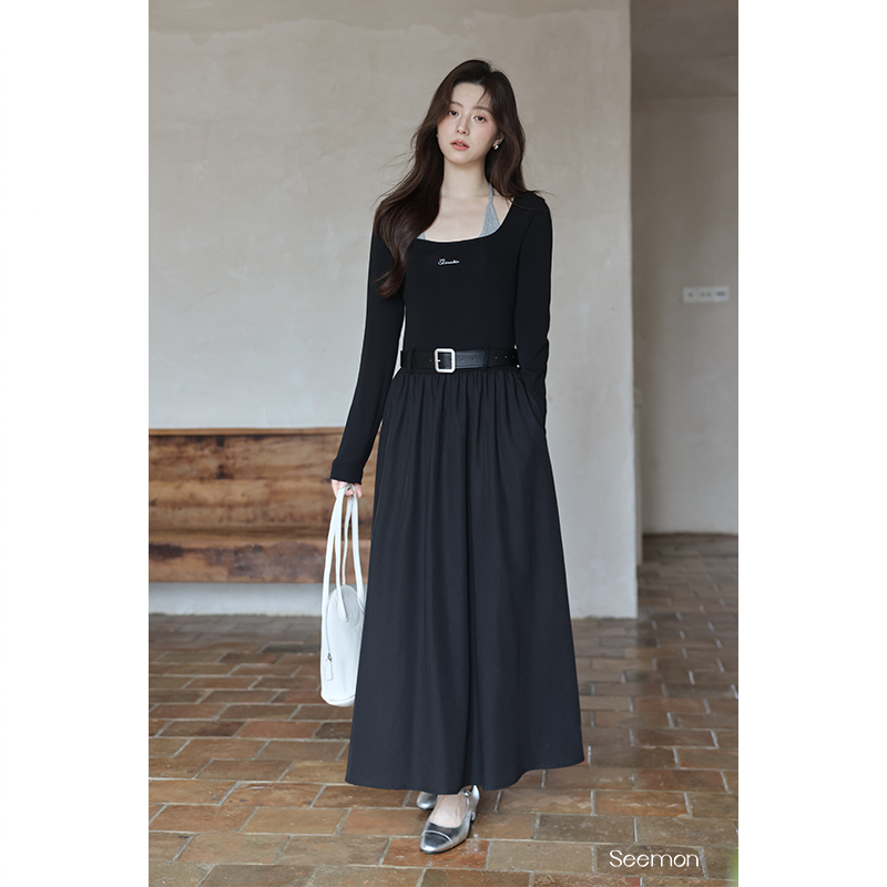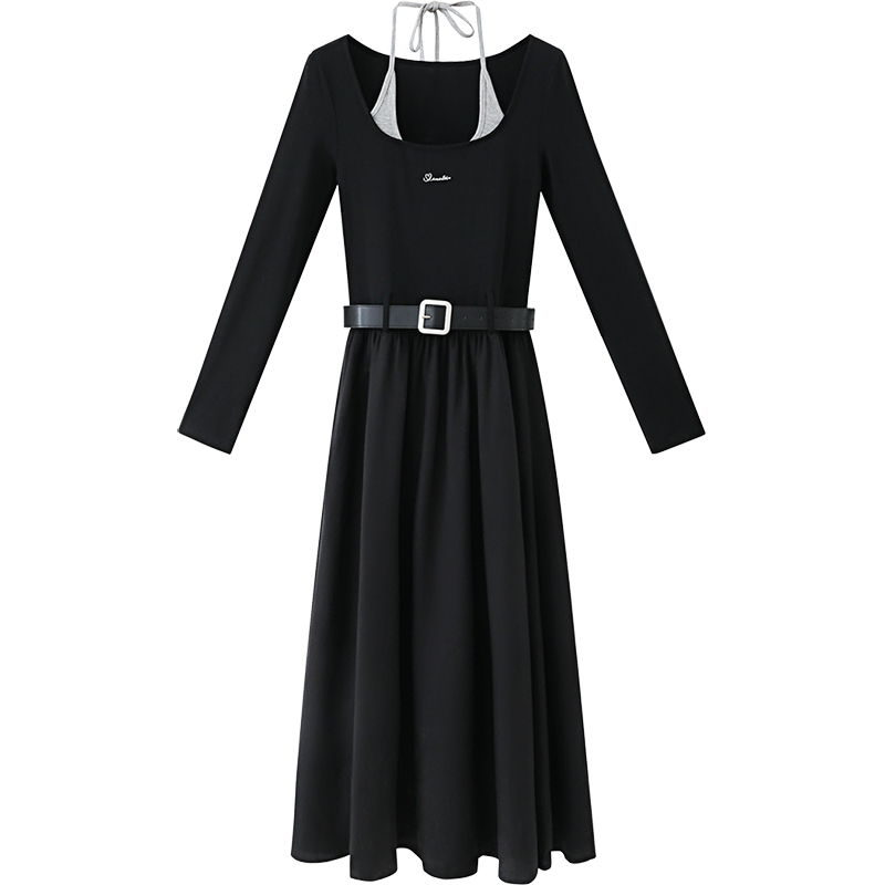 夕蒙2025新款 韩系气质裙子小众小个子流行假两件黑色连衣裙女 秋季