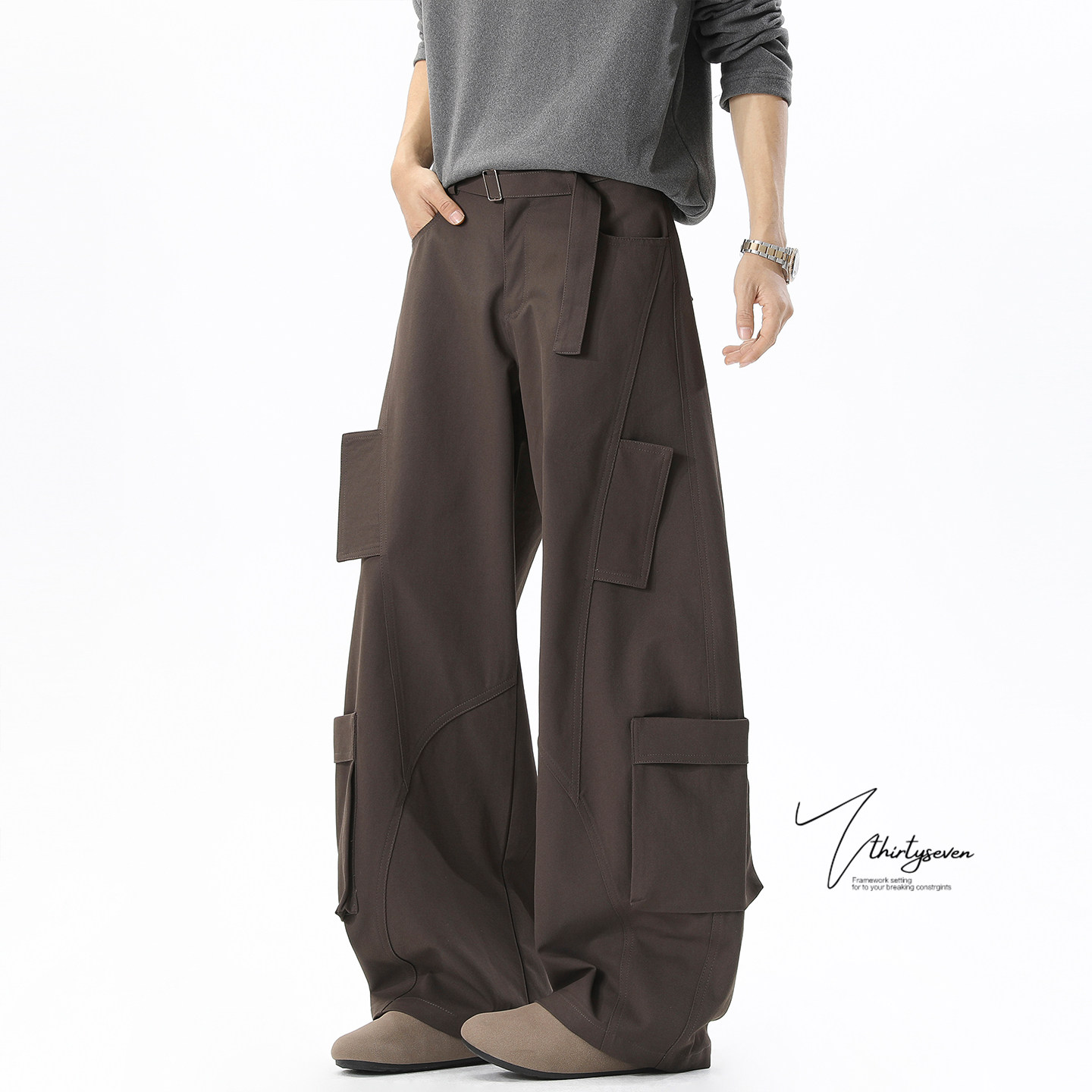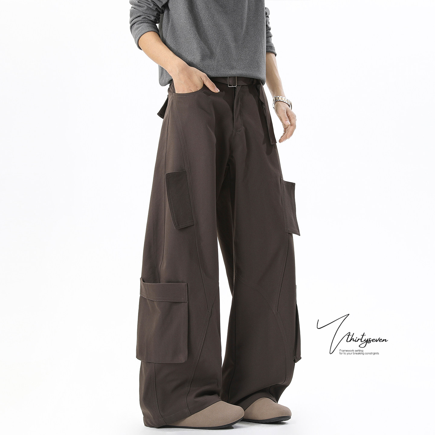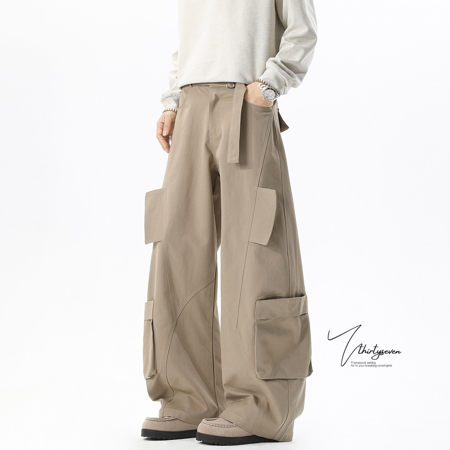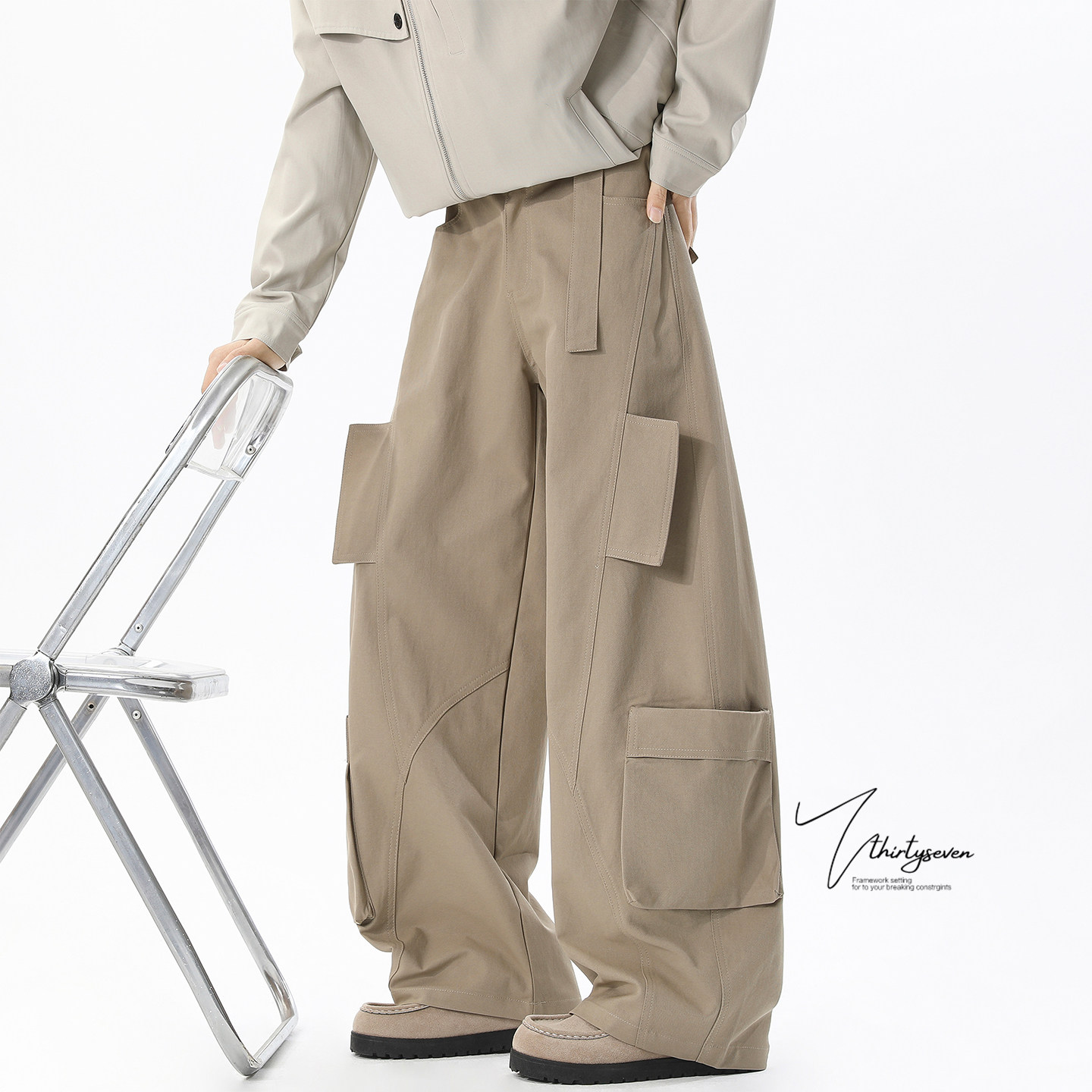 直筒阔腿长裤 V37美式 宽松工装 男春季 潮 卡其色大口袋设计感休闲裤