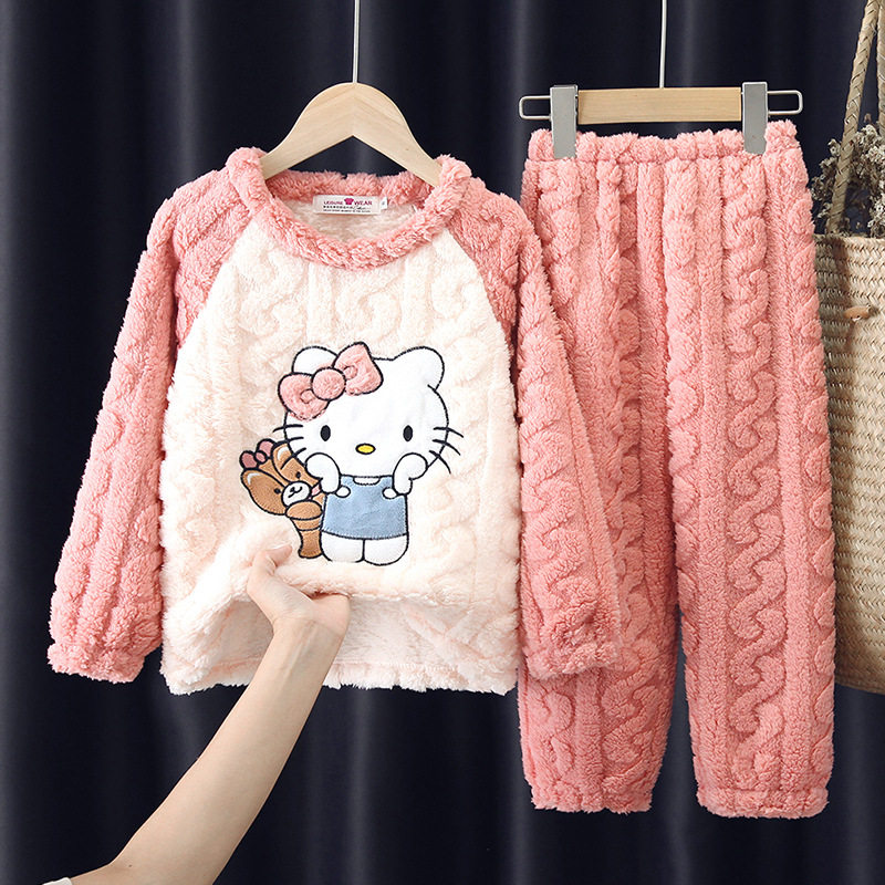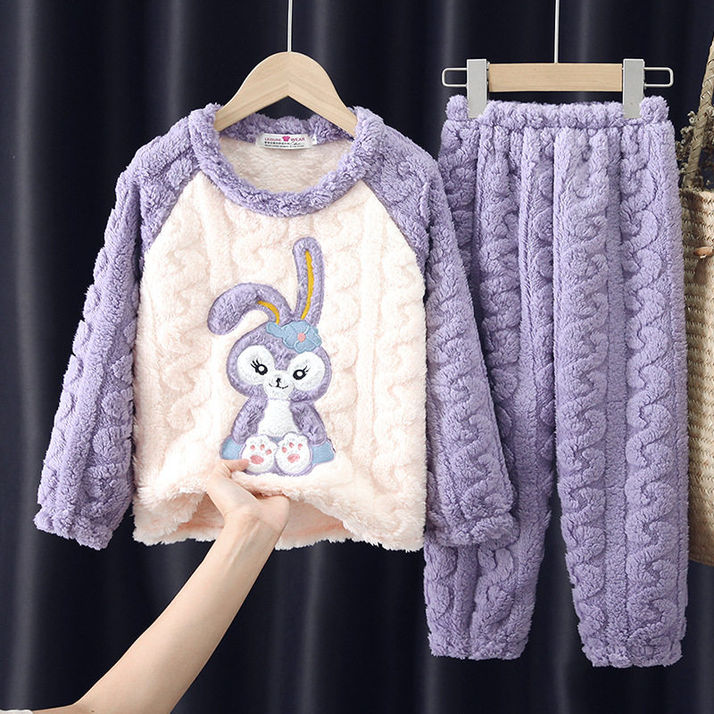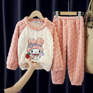 珊瑚绒女童睡衣圆领套头秋冬季 加厚提花法兰绒卡通儿童家居服套装