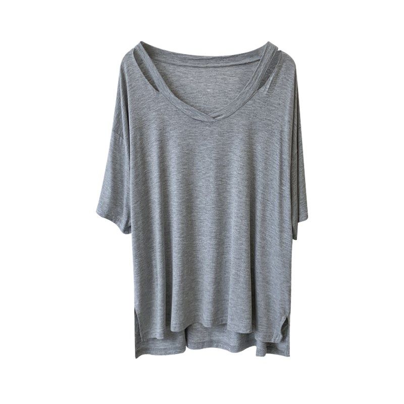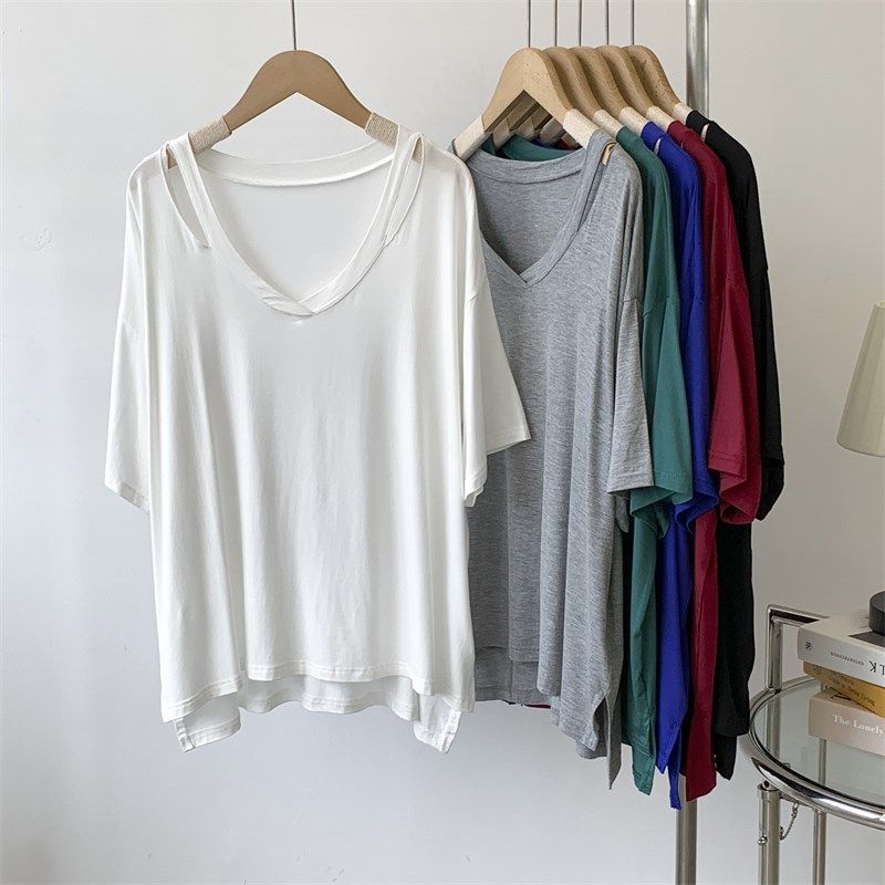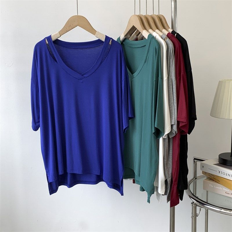 速发莫代懒蝙慵袖 性感露肩T恤宽松蝠尔风镂空居家上衣木代尔T恤