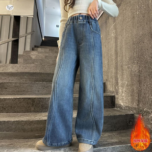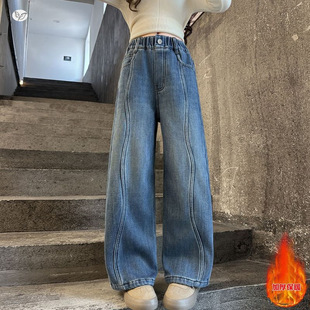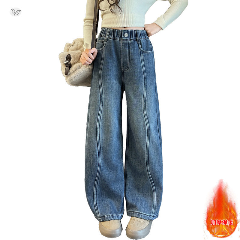 长裤 女童牛仔裤 中大童设计感冬装 波纹拼接阔腿裤 秋冬加绒2025新款