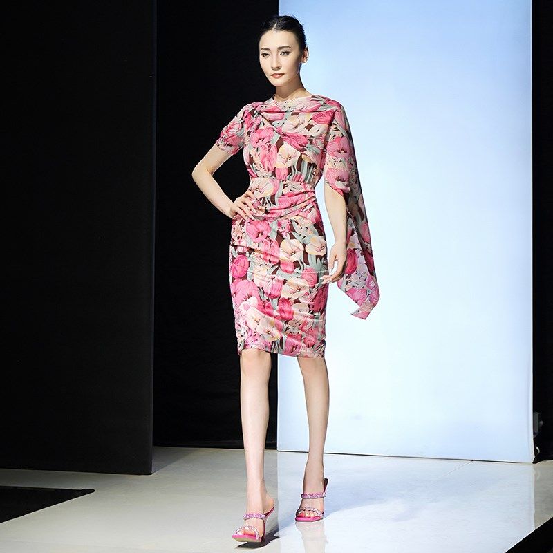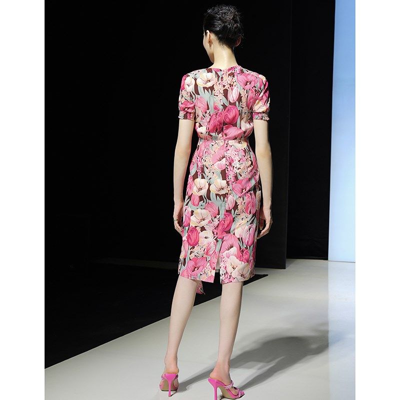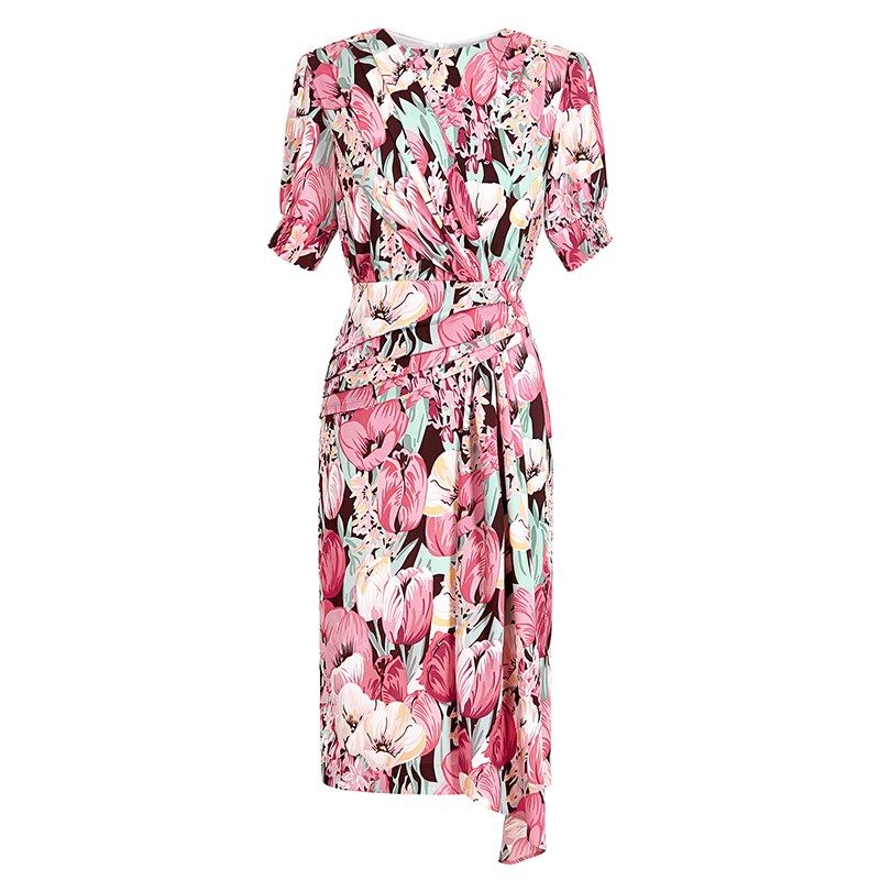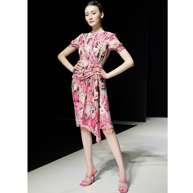 连衣裙 雪纺印花女装 2025夏法式 轻薄桑花绉设计感不对称飘带泡泡袖