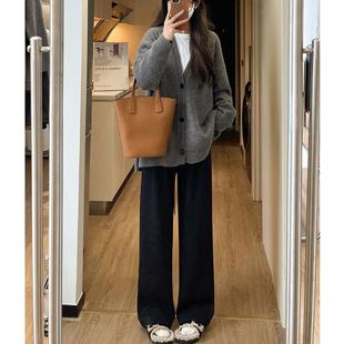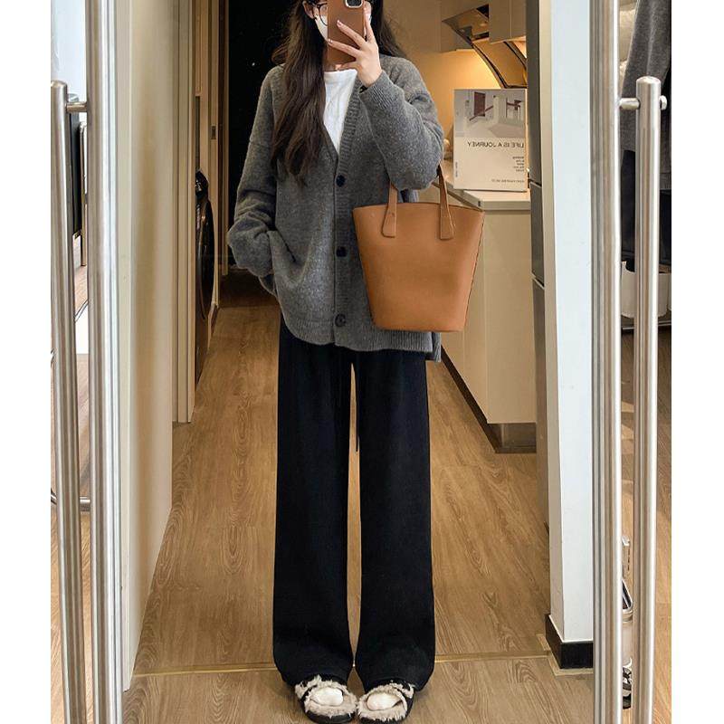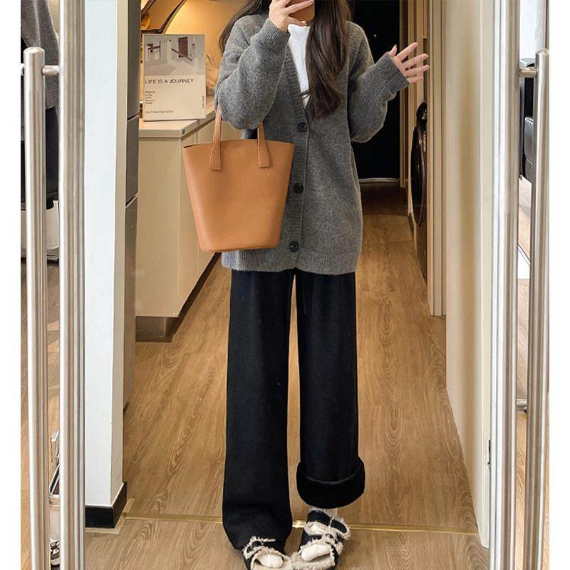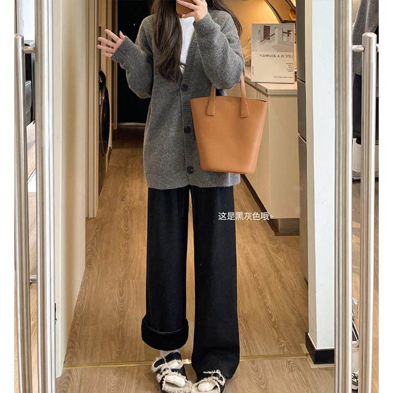 字 高腰垂感加绒加厚保暖小个子阔腿裤 黑灰色糯米裤 女秋冬2026新款