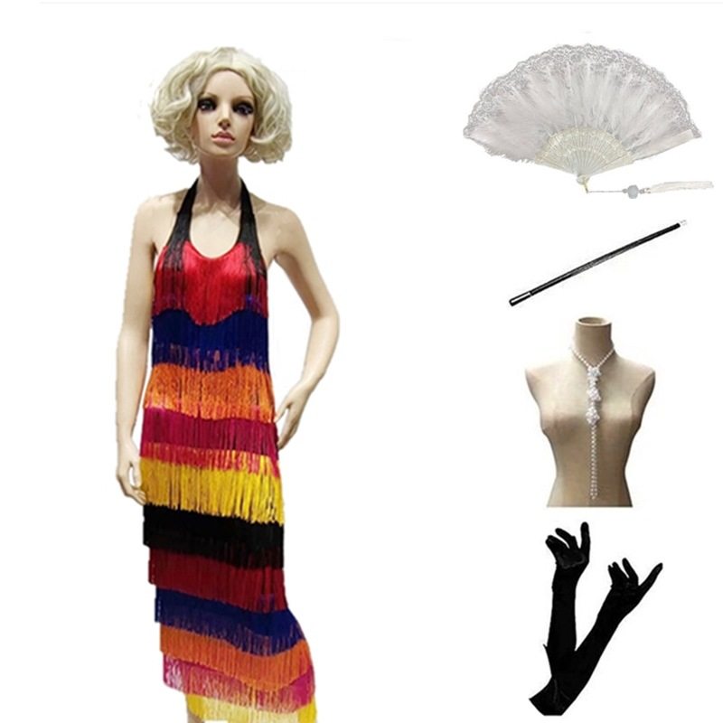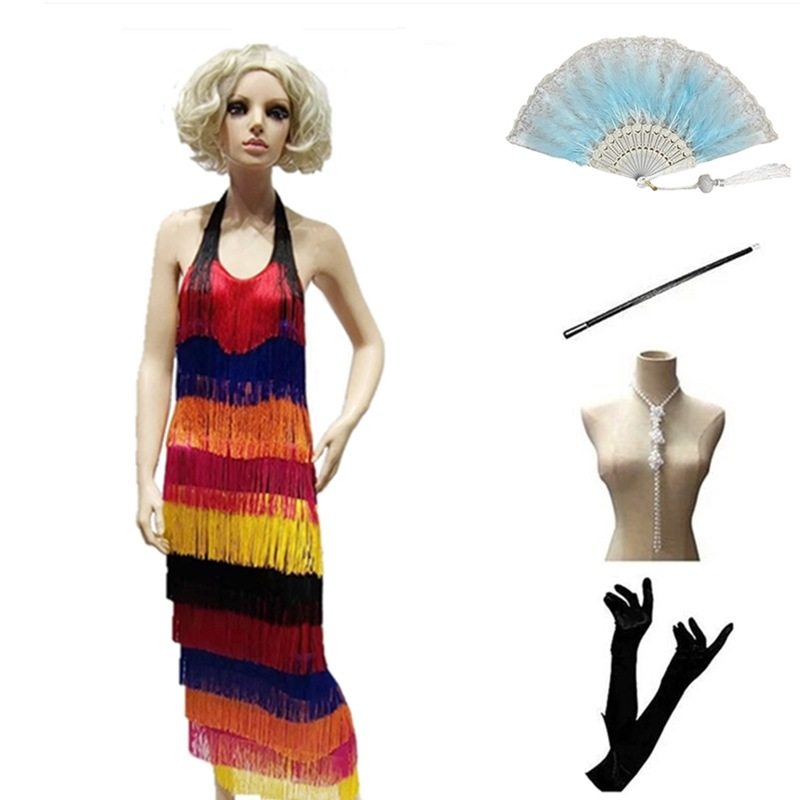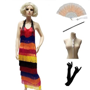 新款 1920S波西米亚彩虹流苏连衣裙性感露背拉丁舞表演服
