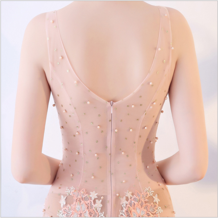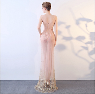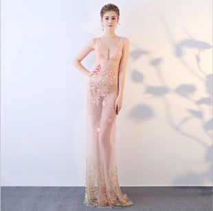 车展 深V领镂空长款 透肉连衣裙性感透视礼服晚装 蕾丝手工定制修身