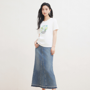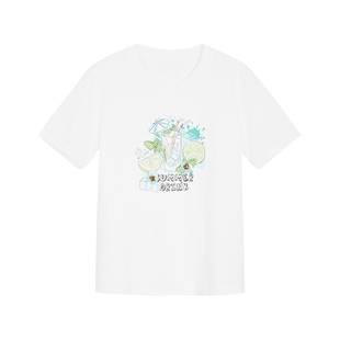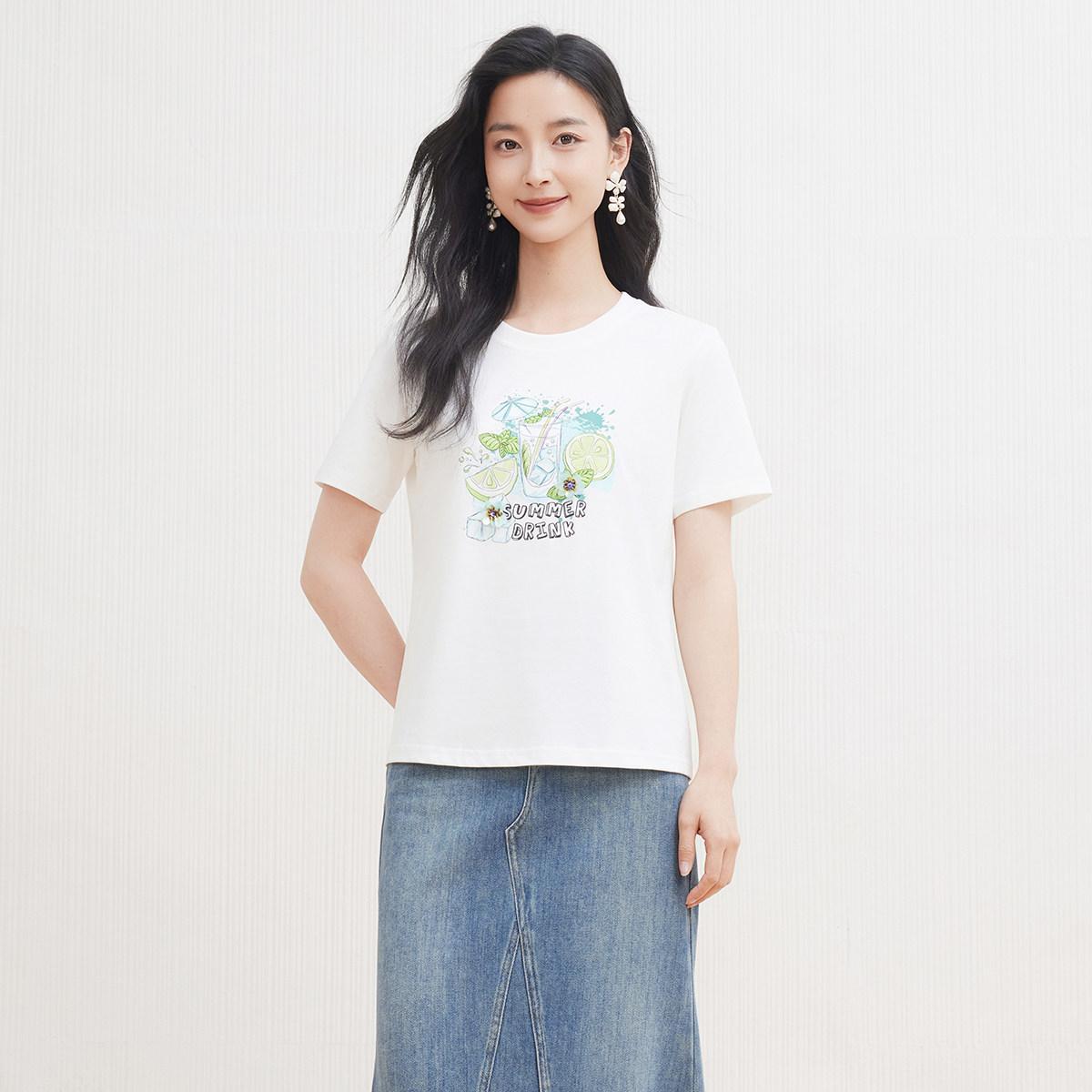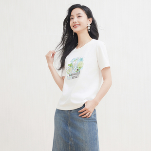 上衣休闲日常 饰珠串点缀短袖 佳人苑T恤女2025年夏新款 圆领印花装