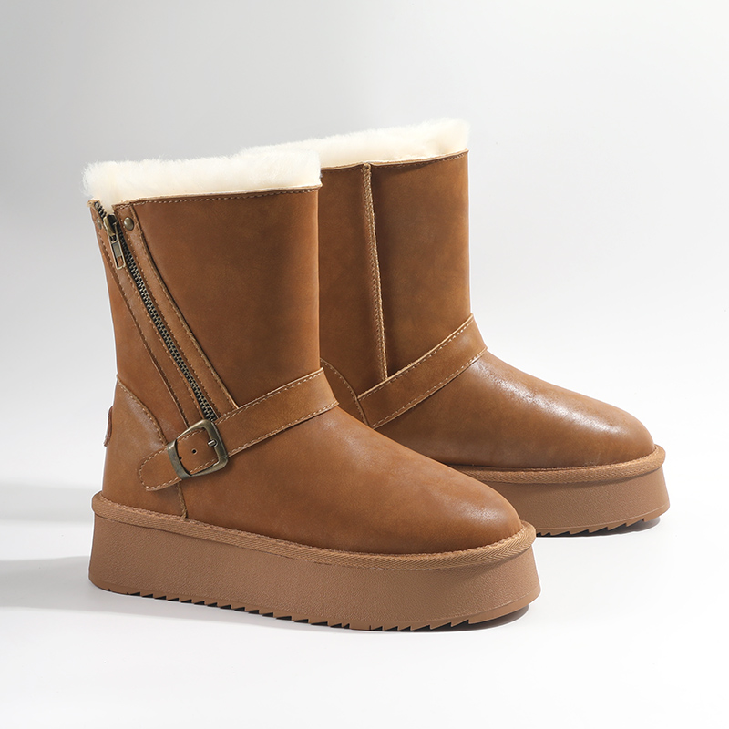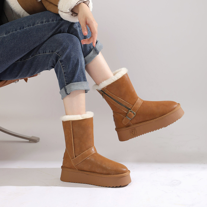 高帮中筒羊毛厚底雪地靴女高筒冬季 加绒加厚皮面防水拉链面包棉鞋