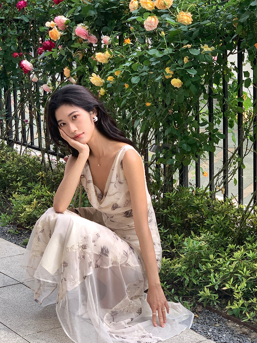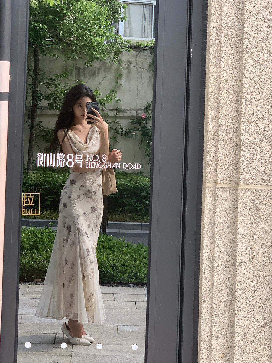 Norain不下雨 气质碎花荡领鱼尾连衣裙女收腰显瘦长裙 5折清仓