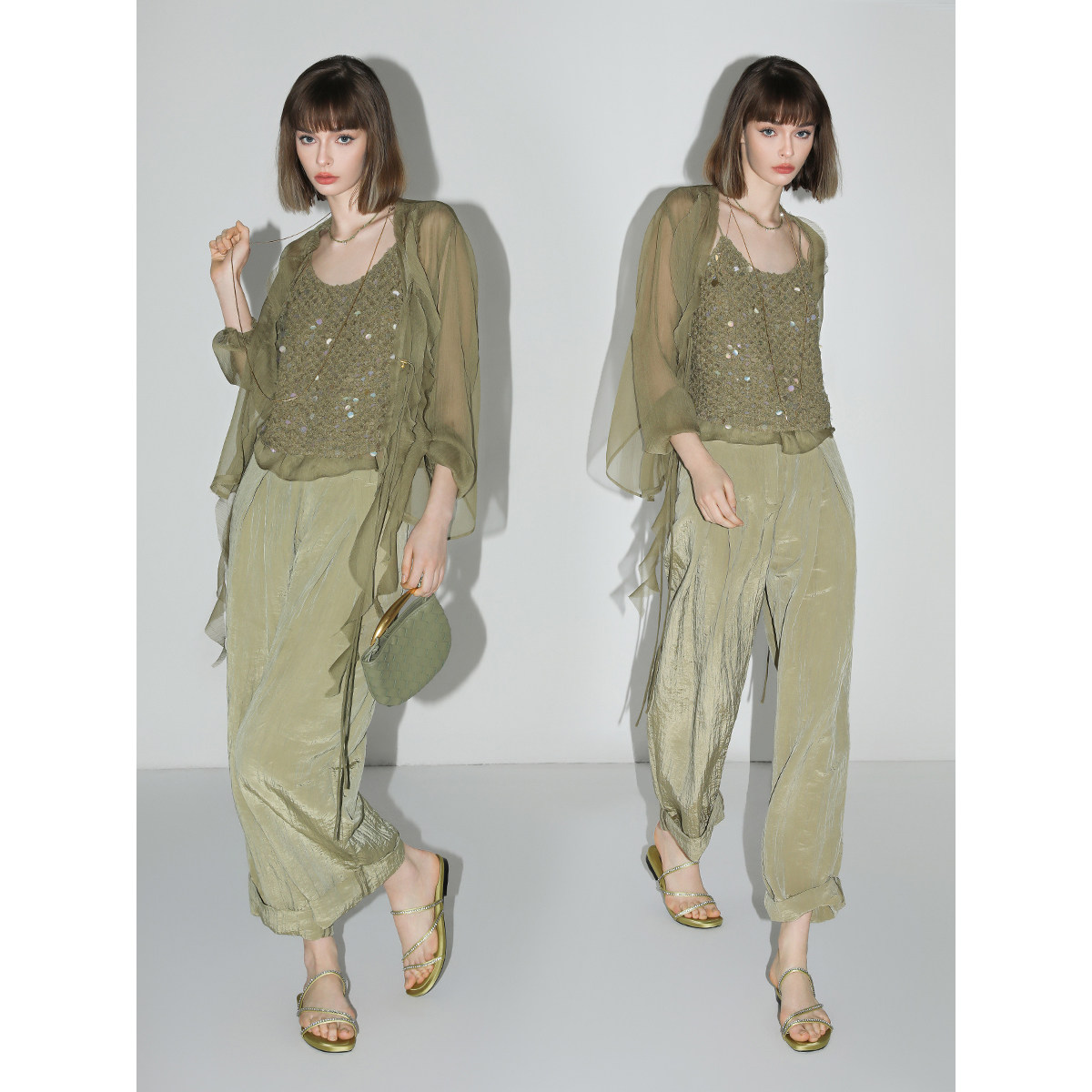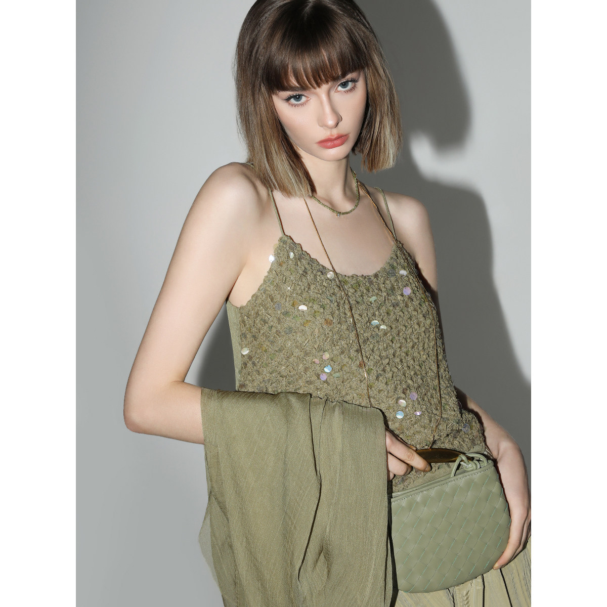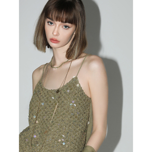 COCOBELLA幻彩亮片编织吊带女夏雪纺拼接荷叶边外穿背心VT3001