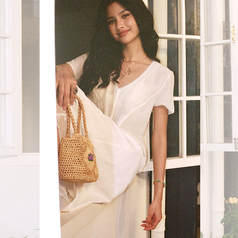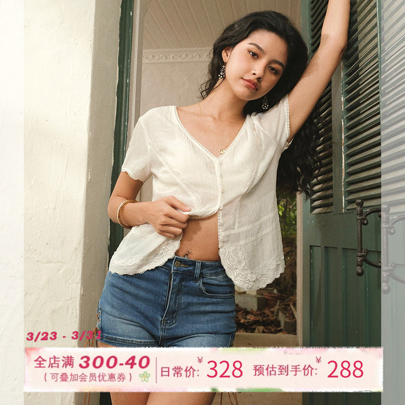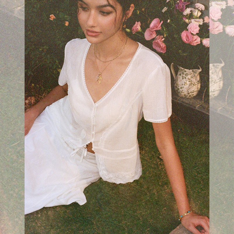 短袖 女早春v领设计感修身 T恤上衣 复古蕾丝花边马甲衬衫 ITSNIKAR
