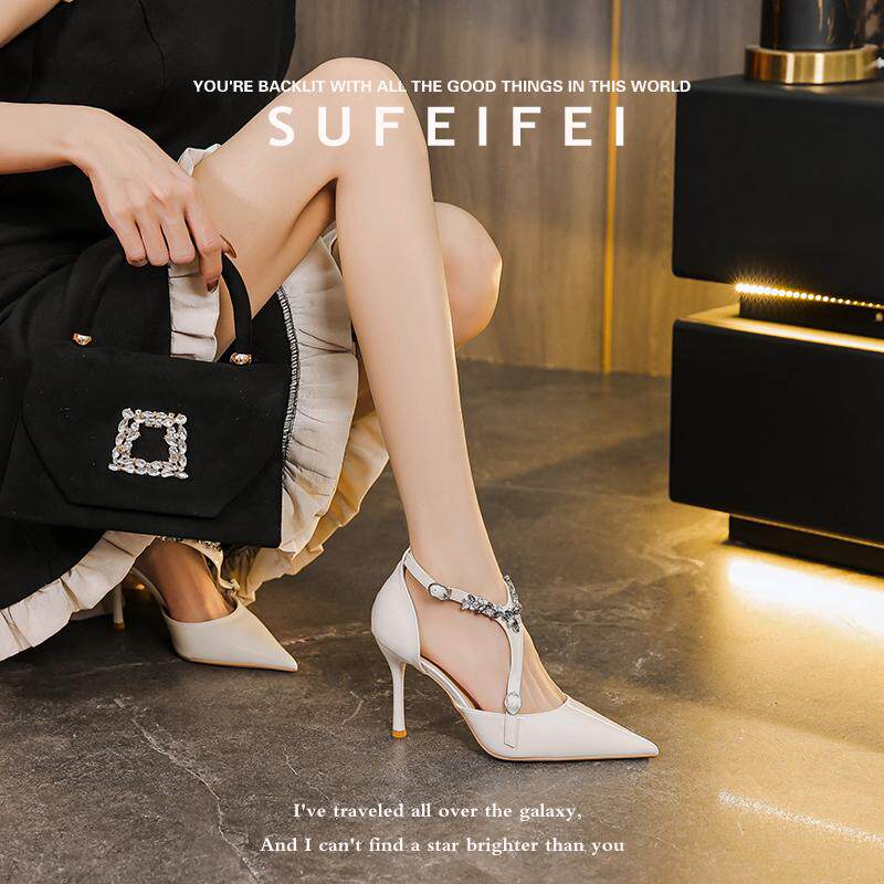 苏妃妃漆皮裸色高跟鞋 气质配裙子 女尖头细跟水钻一字扣包头凉鞋
