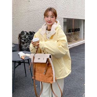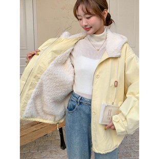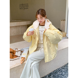 韩版 大码 新款 胖mm奶黄色可爱羊羔毛棉服女冬季 独特超好看外套 女装