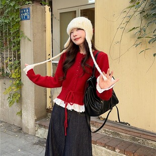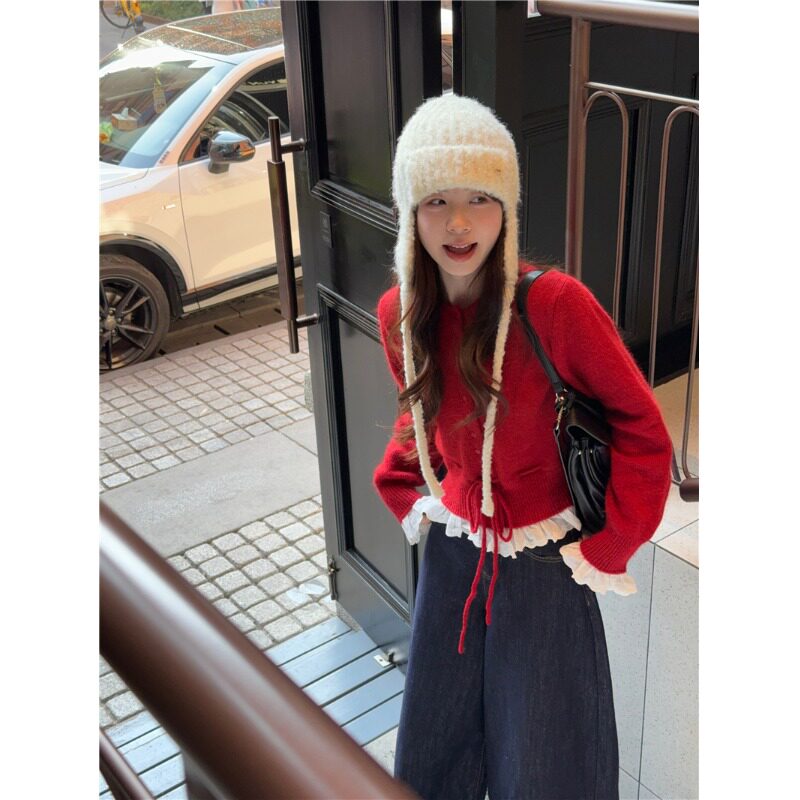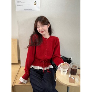 拼接荷叶边收腰显瘦毛衣女秋冬韩系慵懒风高级感红色针织衫 上衣