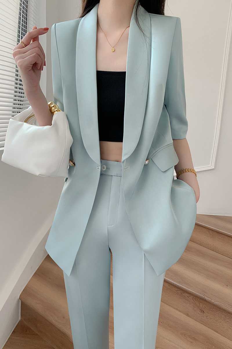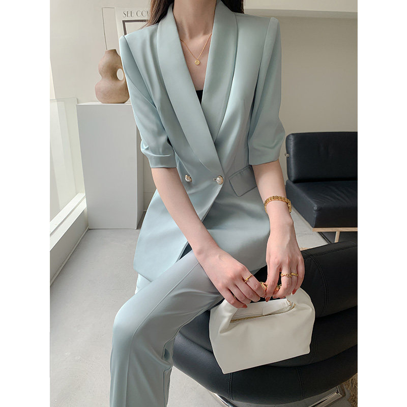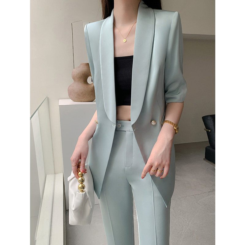 套装 气质两件套职业装 女夏九分裤 时尚 高级感休闲西服 薄款 绿色西装