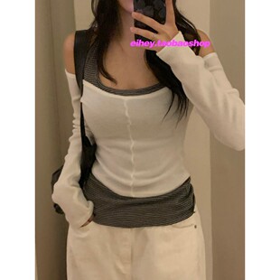 T恤衫 eihey诶嘿中线拼接显瘦纯色露肩短款 弹力长袖 高级感修身 长袖