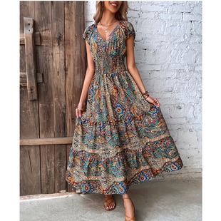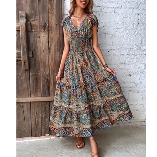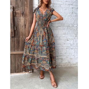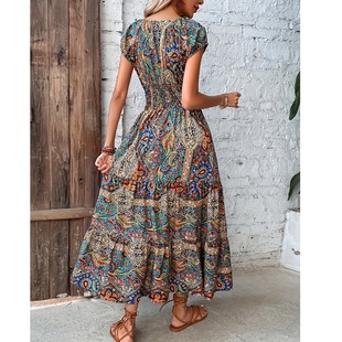 连衣裙度假长裙DRESS 收腰A字拼接短袖 波西米亚风夏季 V领印花修身