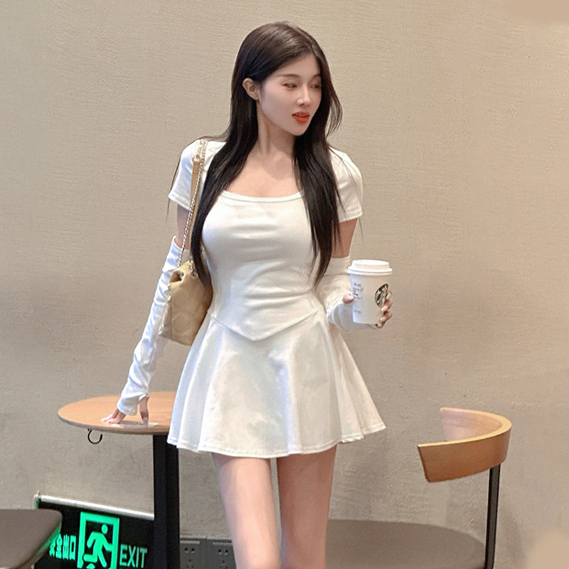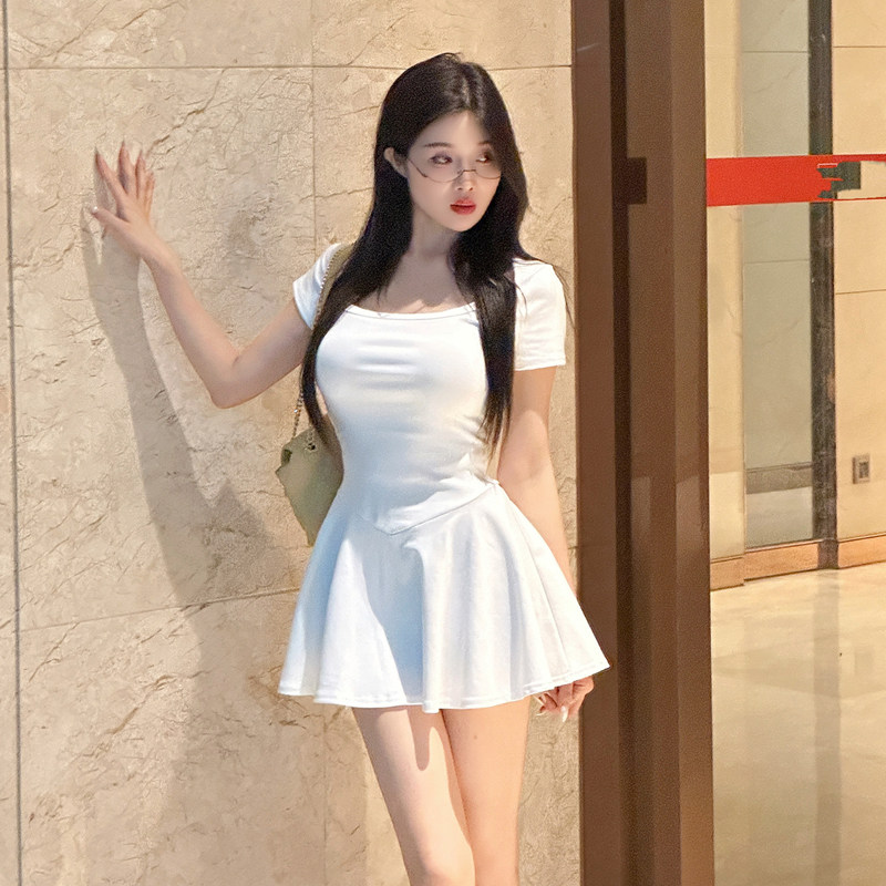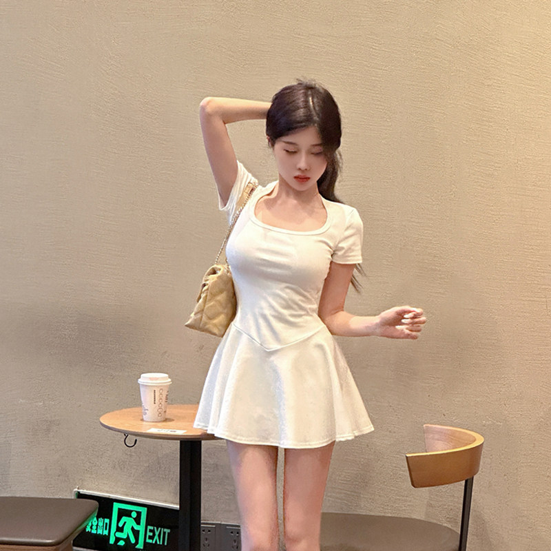 小个子纯欲风露锁骨性感连衣裙夏季 显瘦纯色A字短裙 高腰弹力修身