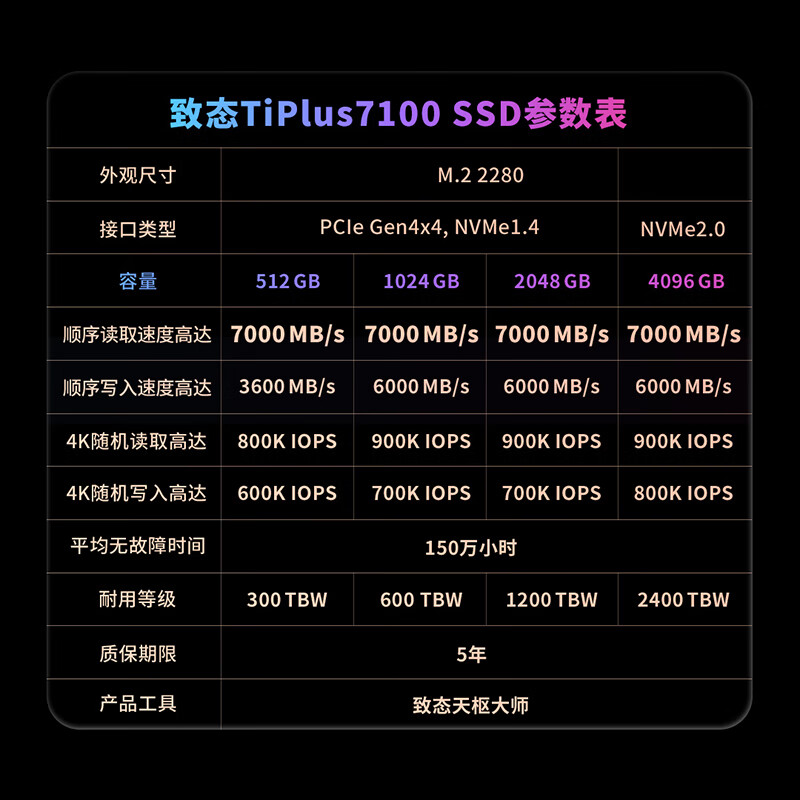 M.2接口TiPlus7100 SSD固态硬盘NVMe ZhiTai致态长江存储1T