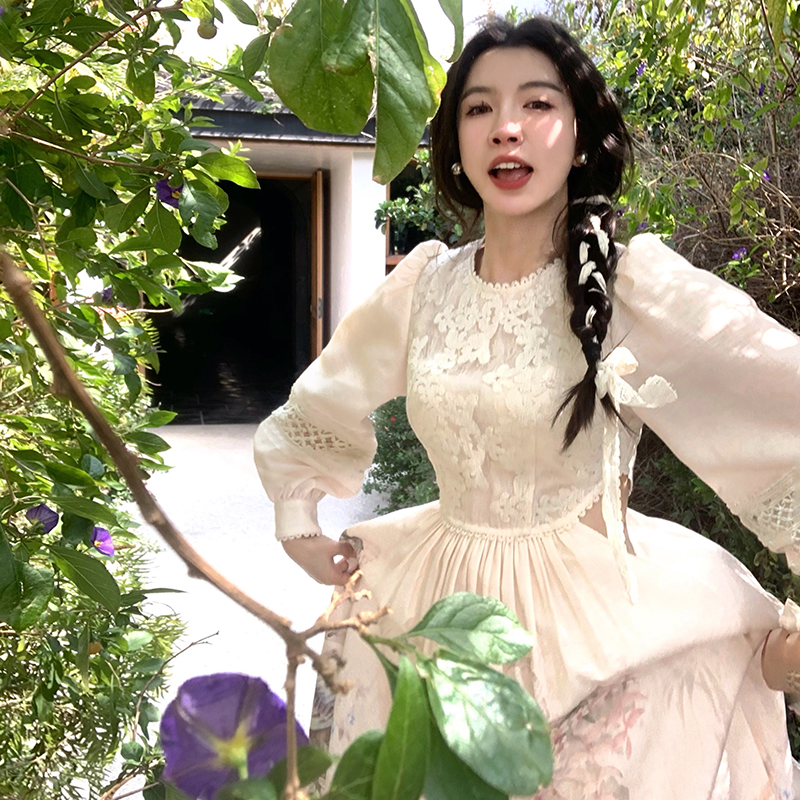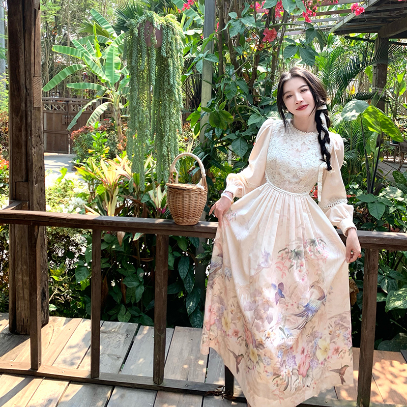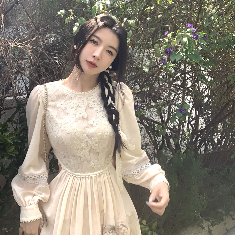 收腰裙子长裙 印花镂空刺绣高级感连衣裙独特漂亮春装 渔小平 花朝