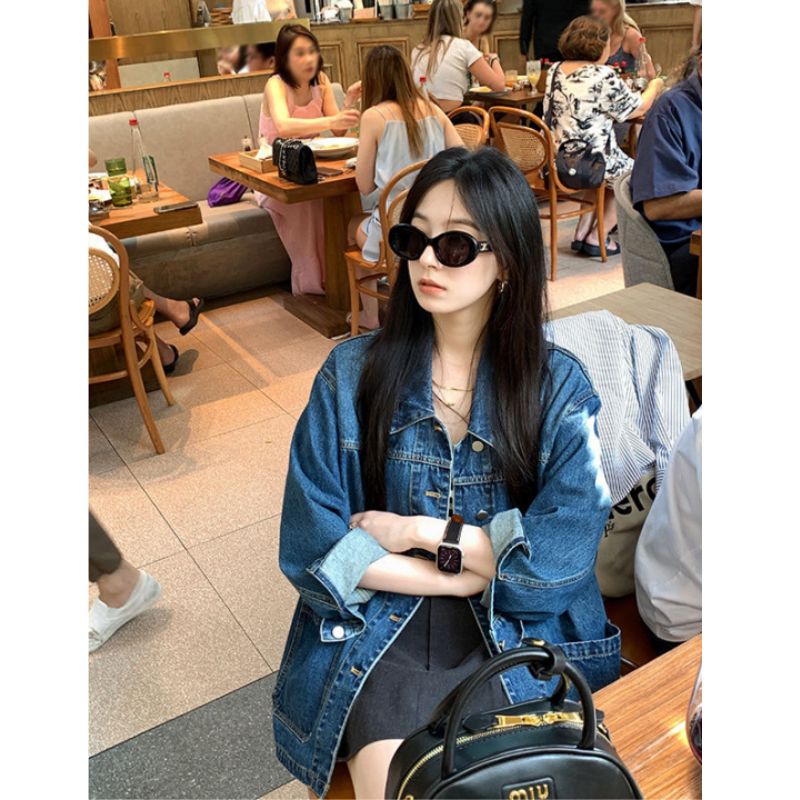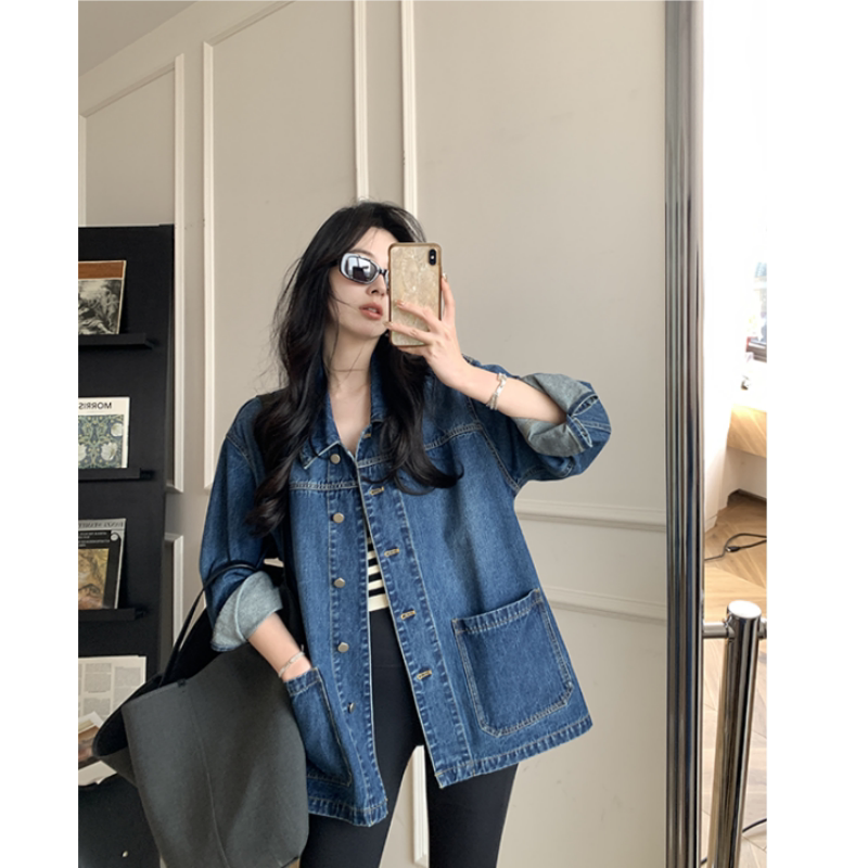 深蓝复古简约休闲宽松翻领牛仔外套女春秋季 百搭廓形外搭上衣夹克