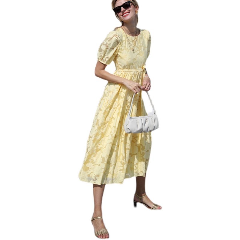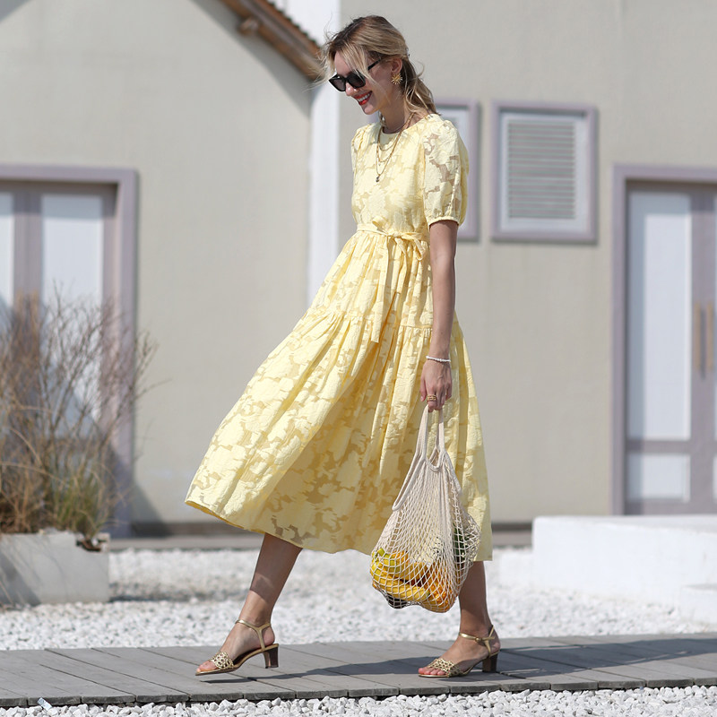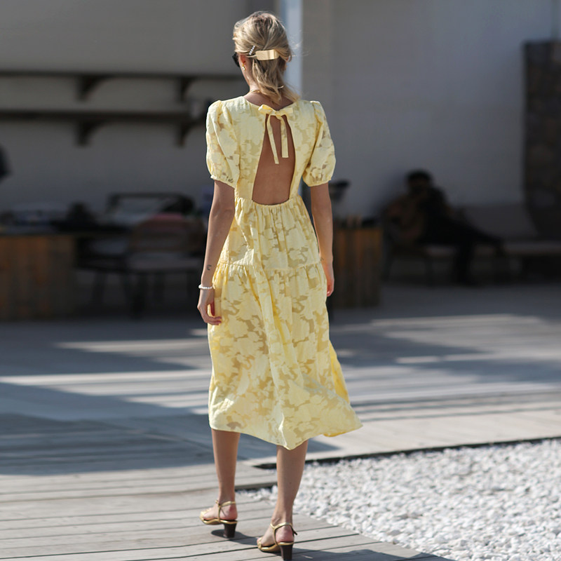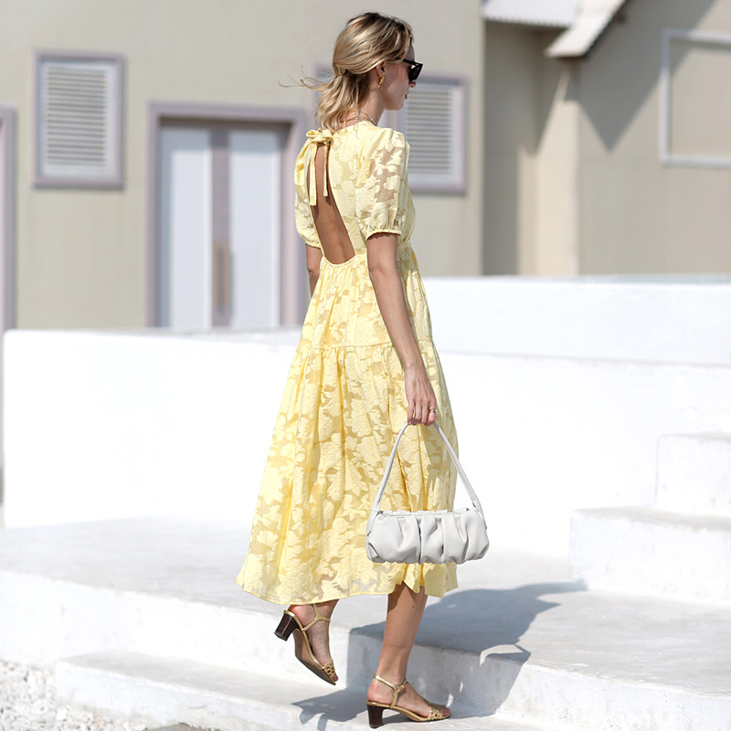 黄色大露背蕾丝a字连衣裙波西米亚长裙女夏泡泡袖 海边度假沙滩裙