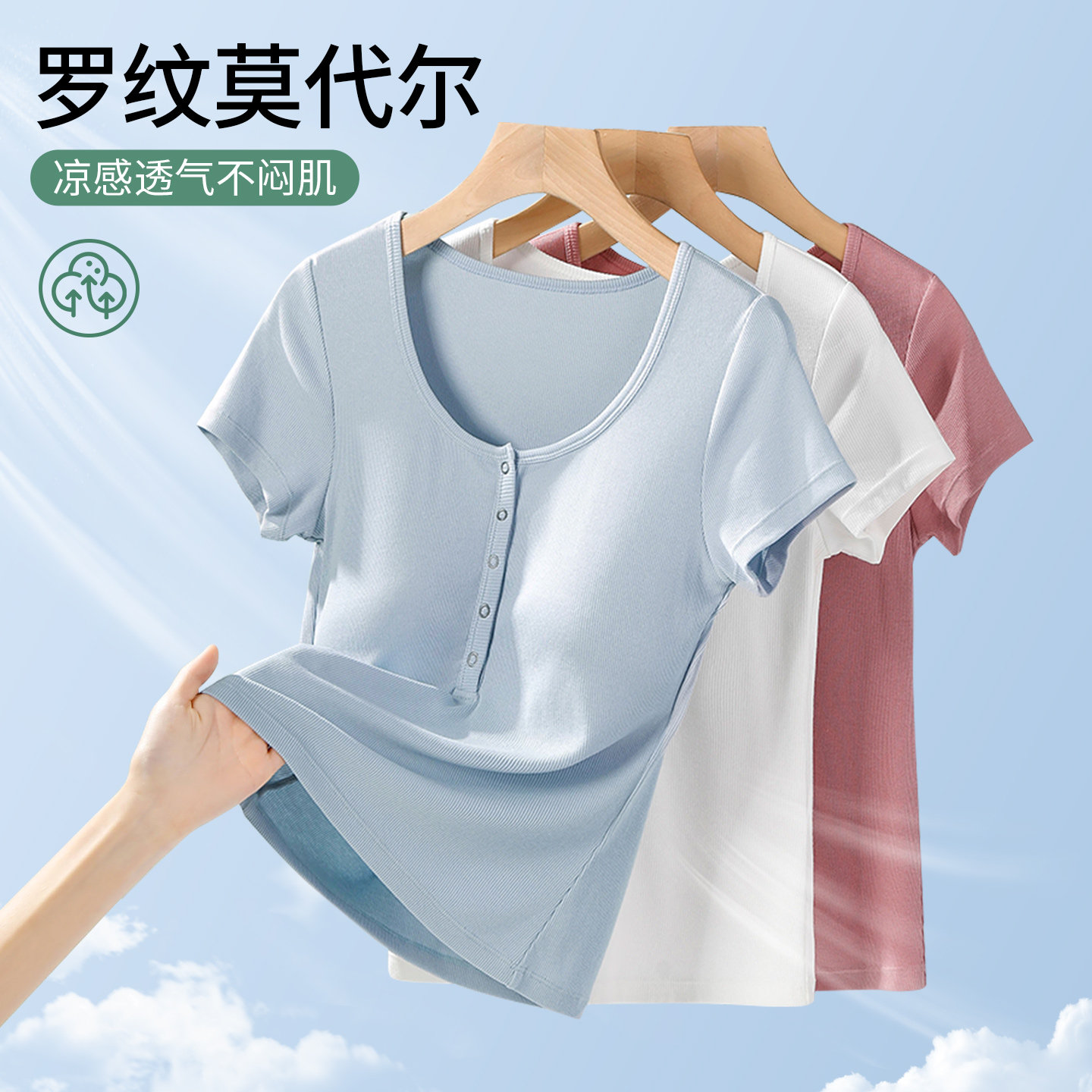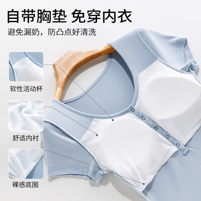 孕妇带胸垫喂奶半袖 哺乳短袖 薄款 春夏季 带胸垫 t恤上衣外出辣妈款