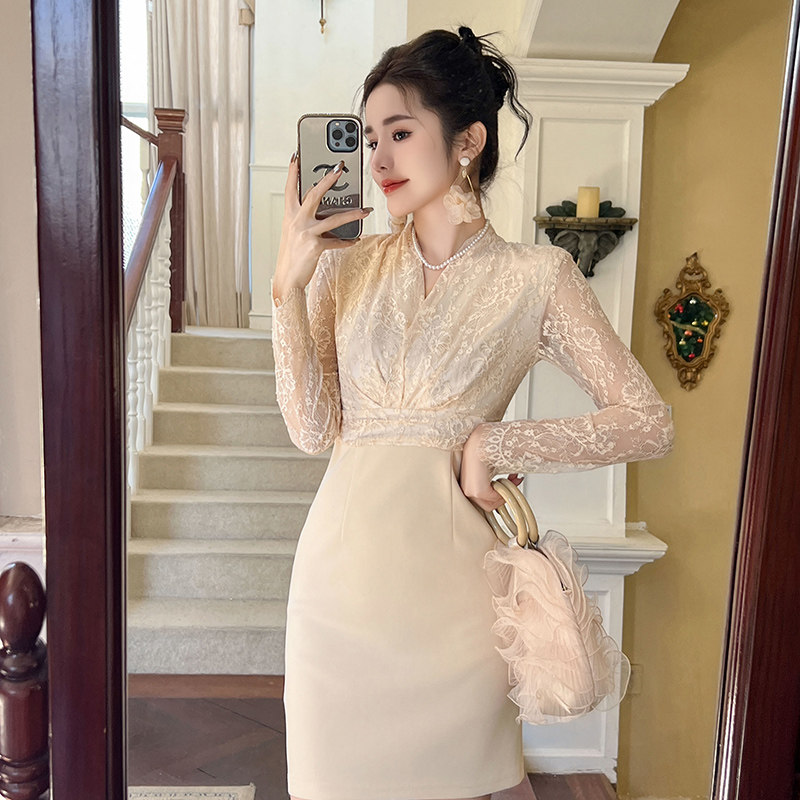 蕾丝a字连衣裙秋冬小个子2025新款 女拼接优雅收腰复古小V领短裙子