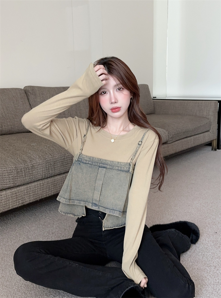小众气质减龄圆领T恤打底衫 女 复古做旧不规则牛仔吊带秋冬套装
