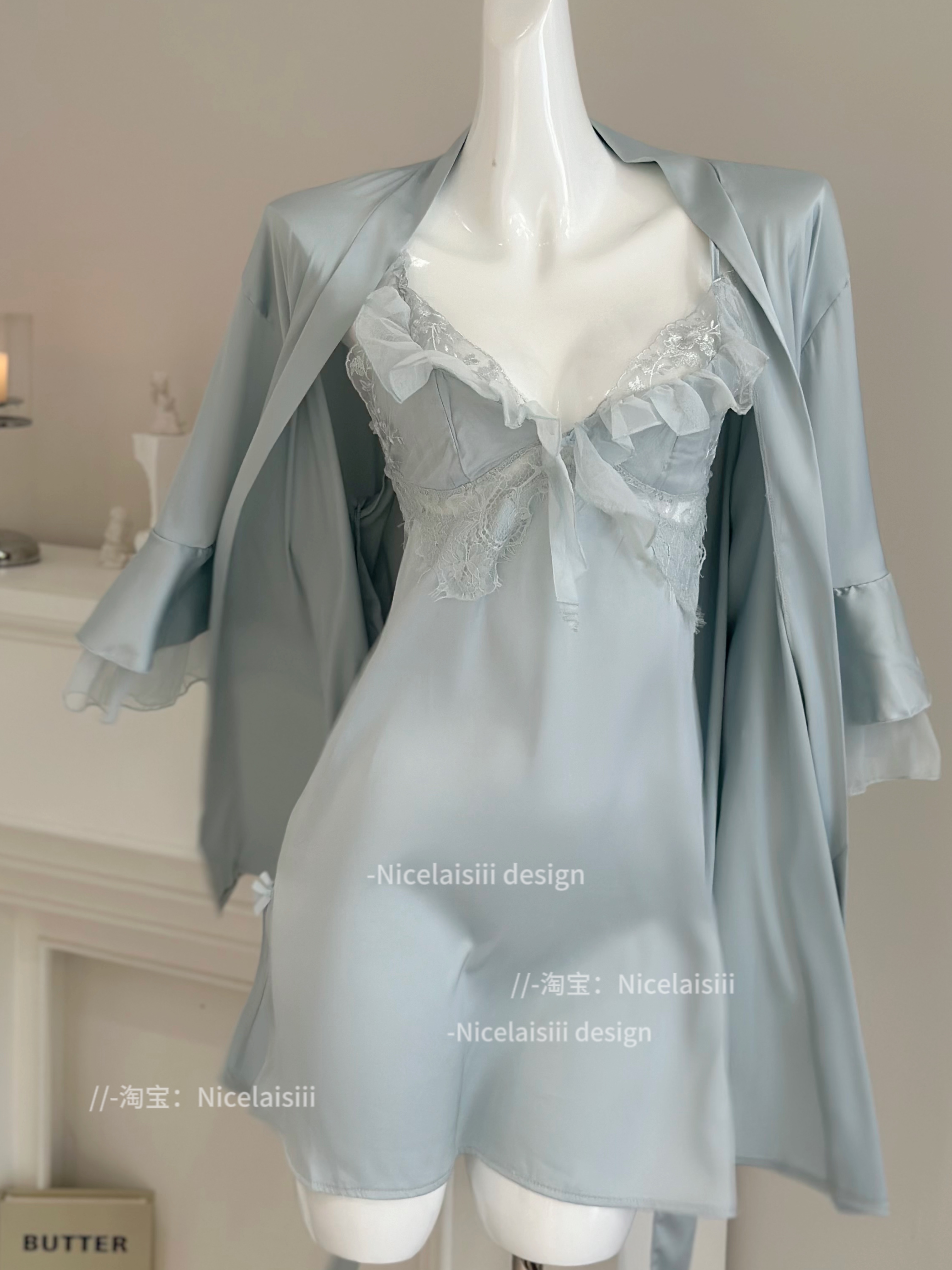 Nicelaisiii隐衫 纯欲风甜美睡裙v领蕾丝性感缎面睡衣家居服 之欲