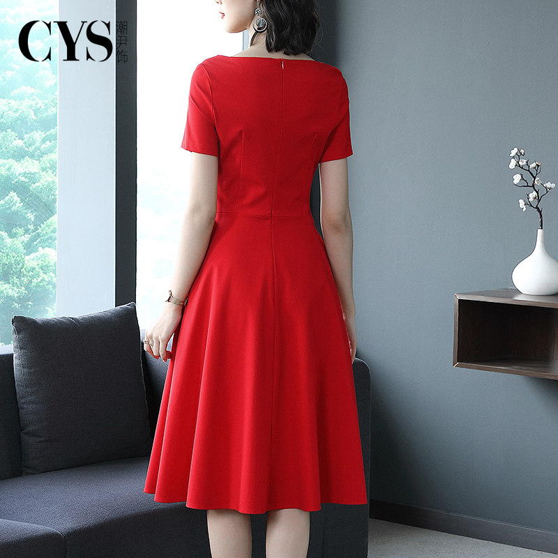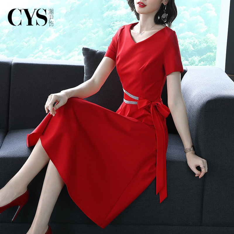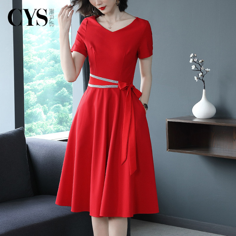 显瘦本命年红裙子 气质名媛V领修身 大红色连衣裙中长款 高端春夏季