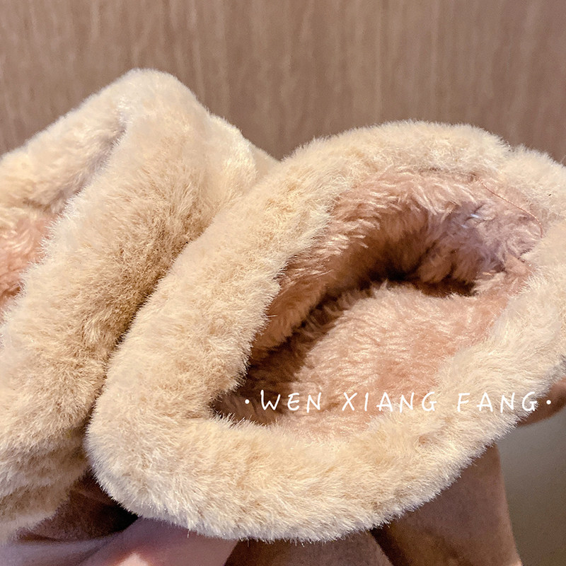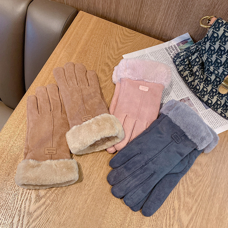 ins手套女冬季 可爱触屏加绒加厚麂皮绒五指手套学生骑行保暖防寒