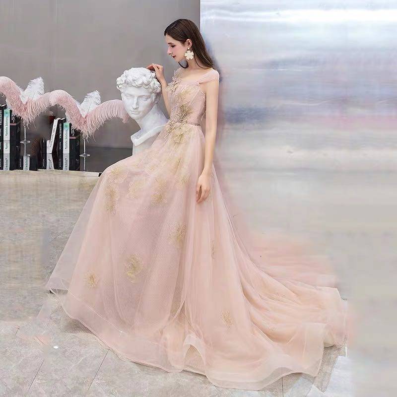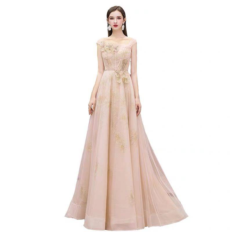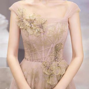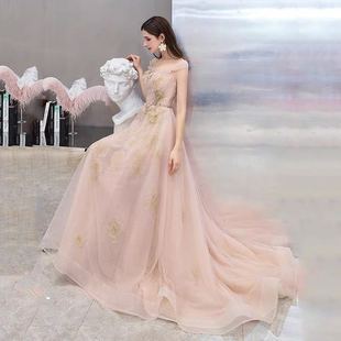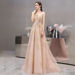 2020新款 伴娘宴会香槟粉色一字肩新娘结婚礼主持人敬酒服礼服女