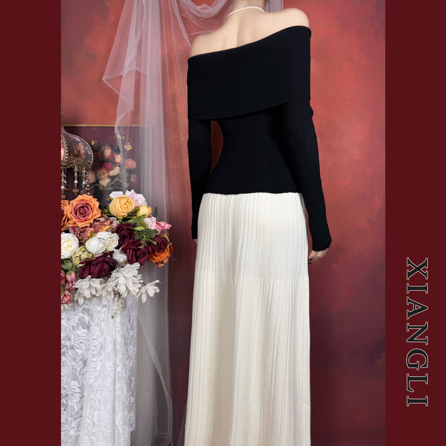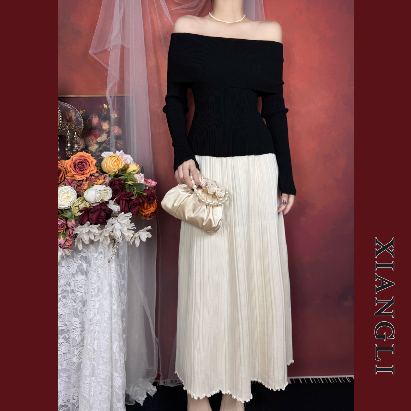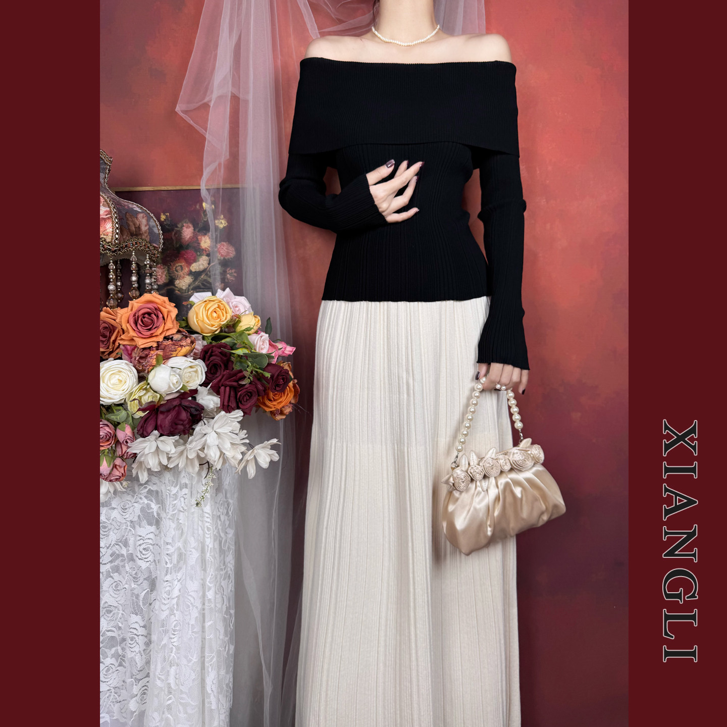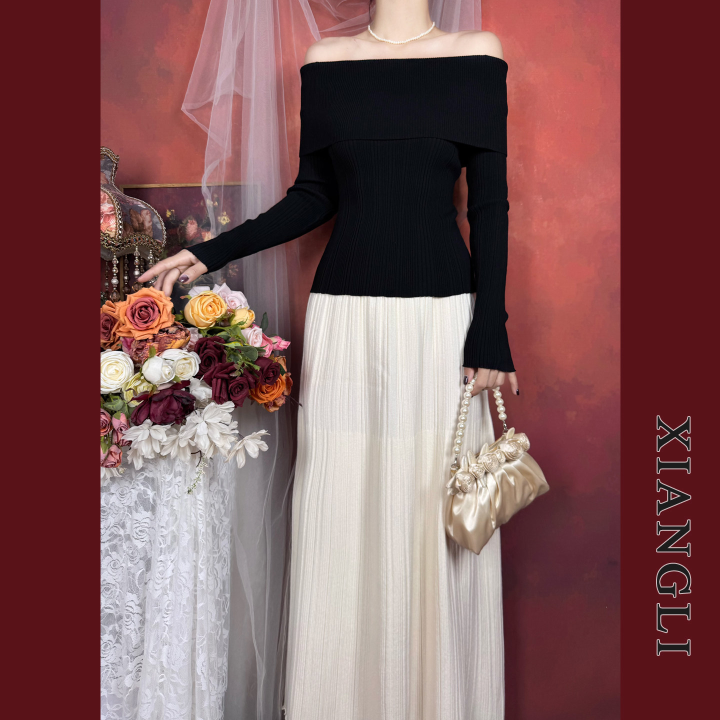 巷里法式 百搭高级性感气质半裙两件套 复古一字肩针织上衣秋冬修身
