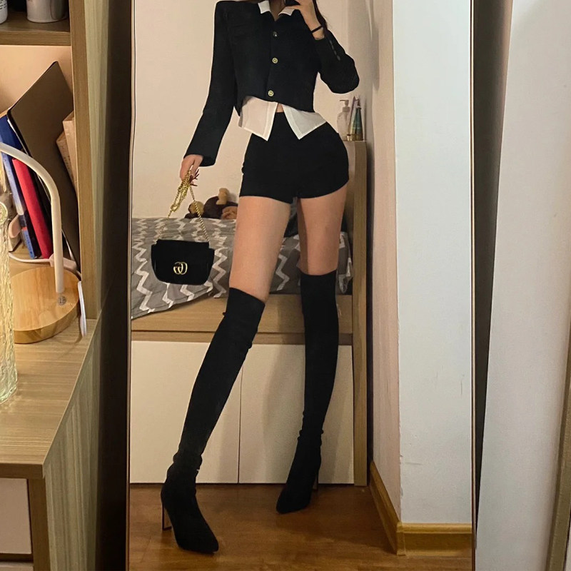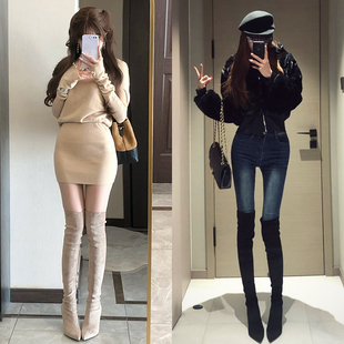 高跟过膝长筒靴女尖头绒面弹力靴2025秋冬新款 不掉筒显腿长高筒靴