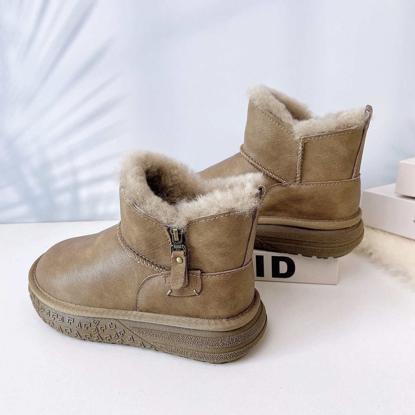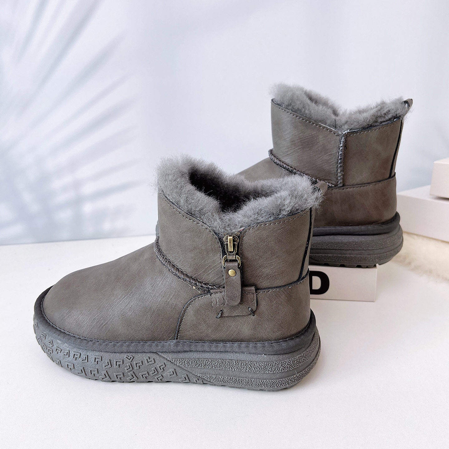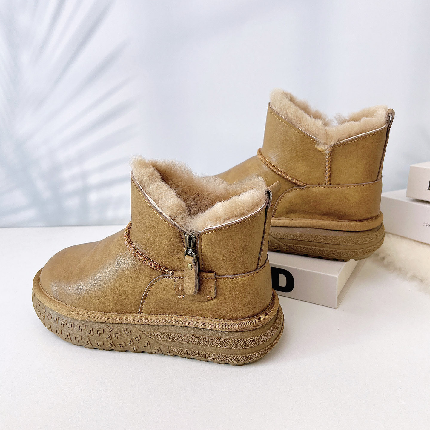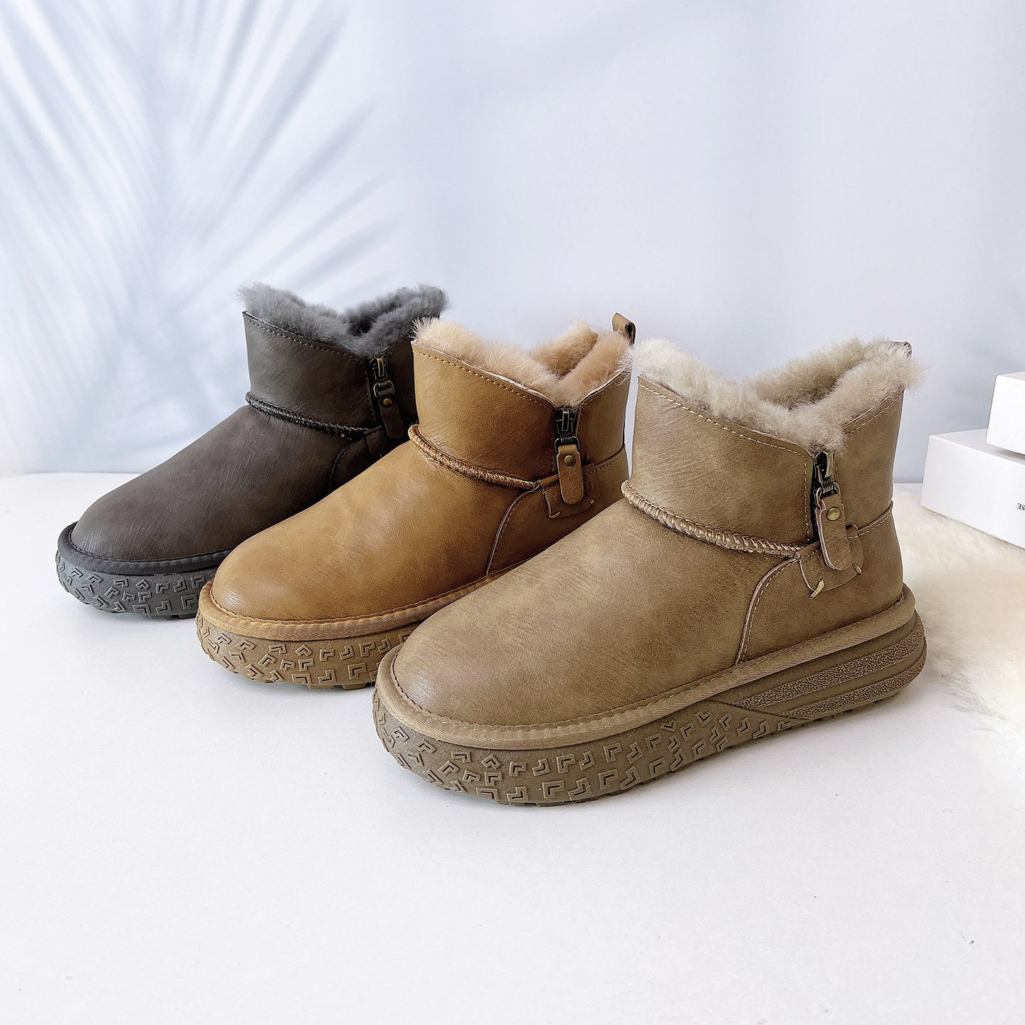 防水皮面雪地靴女款 皮毛一体牛皮全羊毛防滑短靴加厚保暖低帮靴子