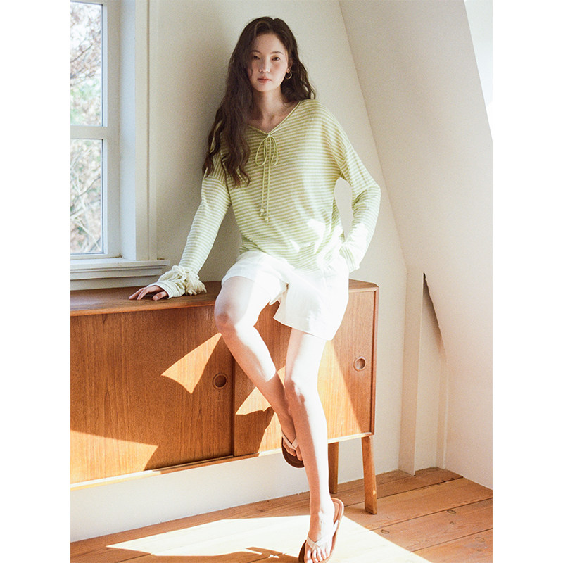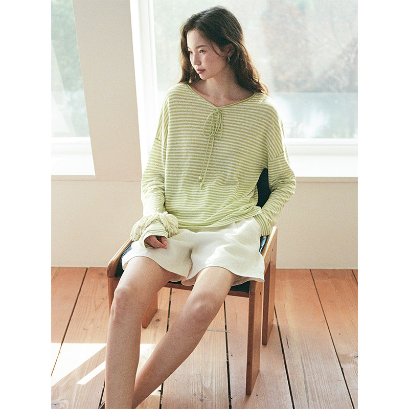 宽松绿色条纹系带套头针织衫 100%亚麻 上衣 Vintage Even