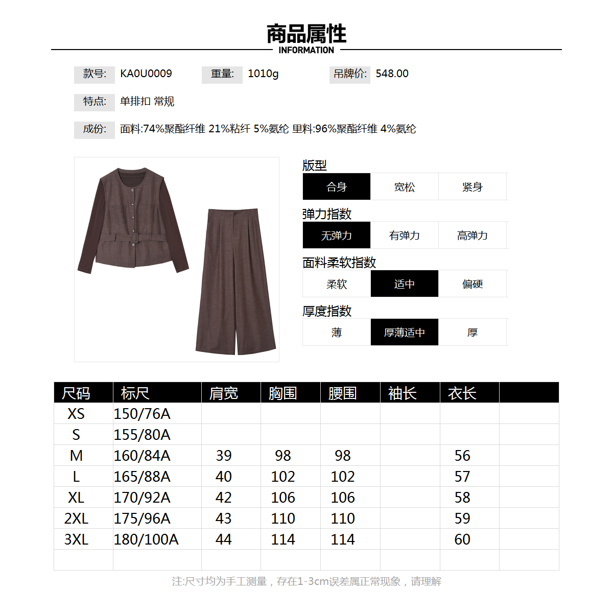 三件套装 KA0U0009长袖 长裤 外穿马甲 女2.24春 上衣