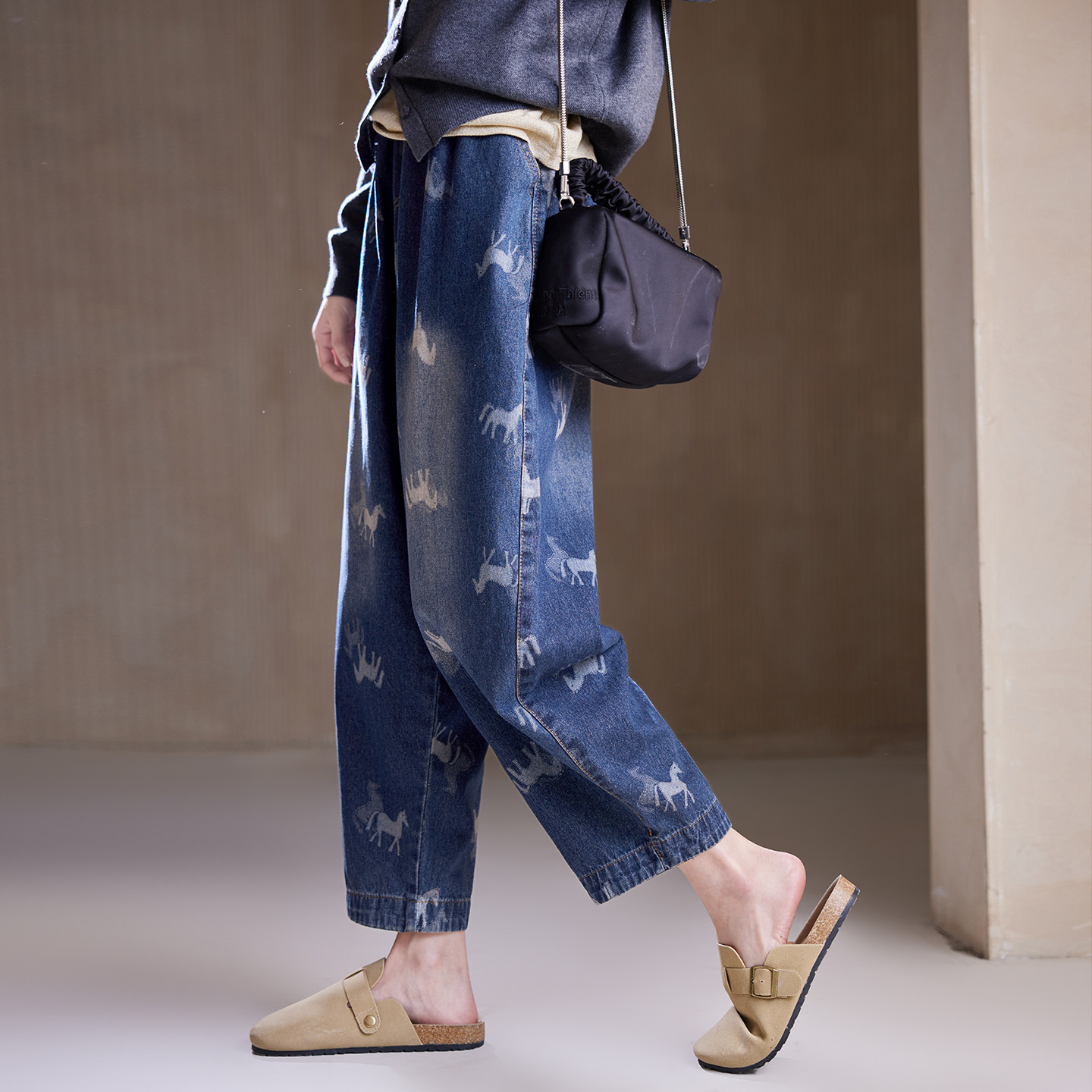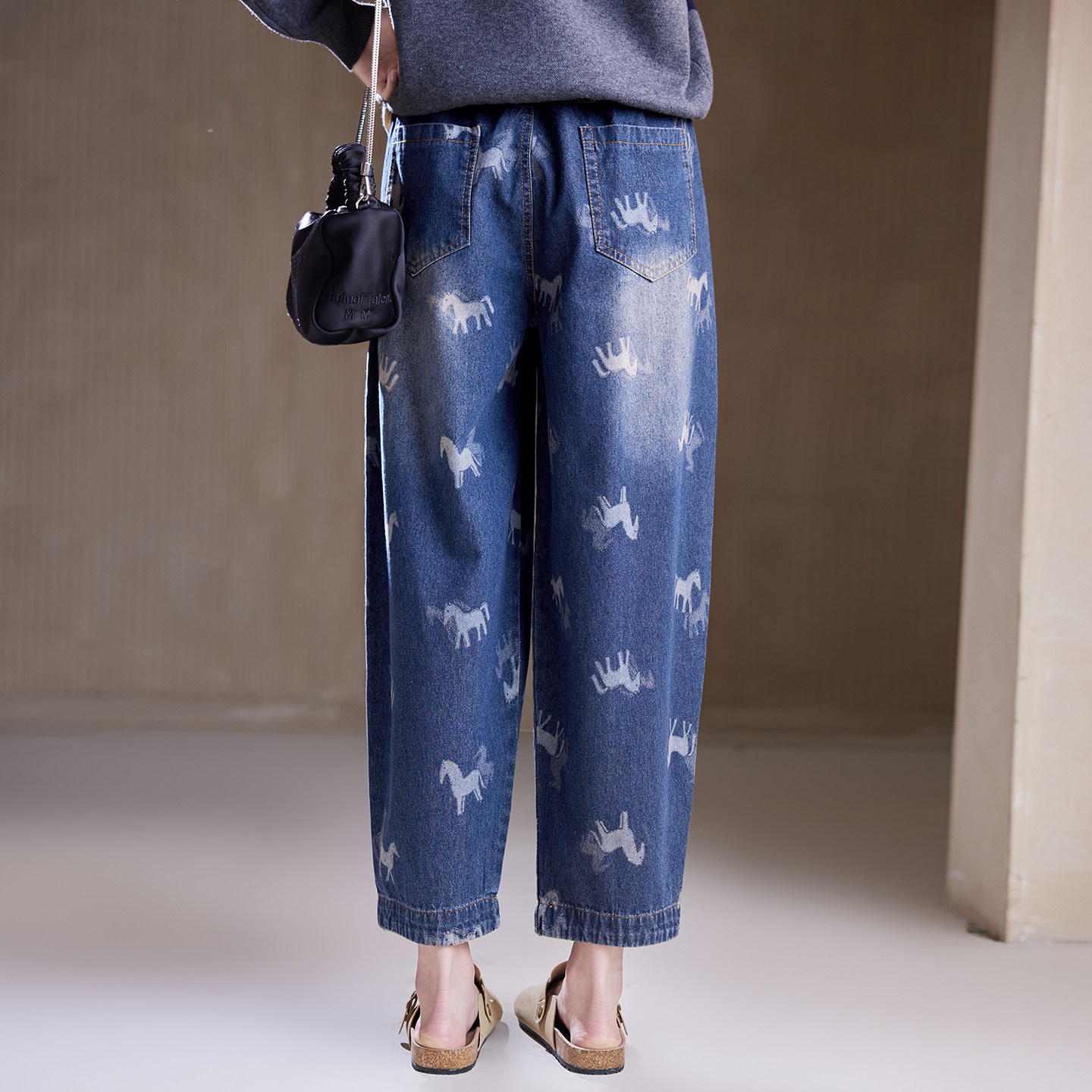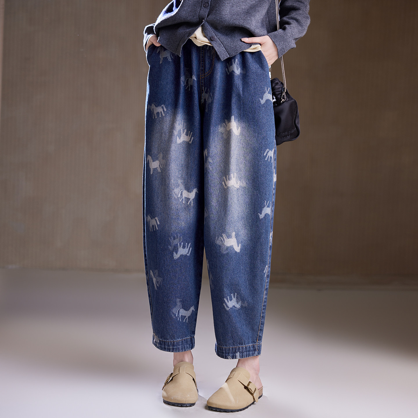 宽松阔腿百搭休闲裤 宝诗黎松紧腰哈伦印花大码 时尚 2026春季 牛仔裤