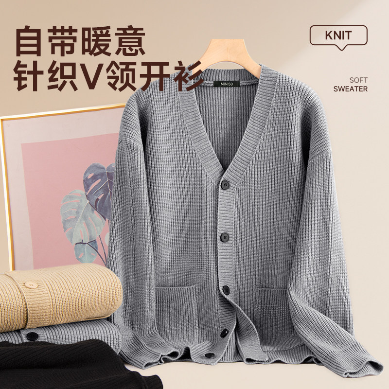 灰色美式 秋季 复古潮流保暖毛衣Y 外套男款 名创优品柔软V领针织开衫