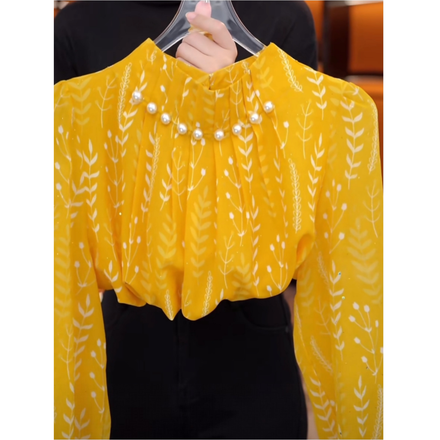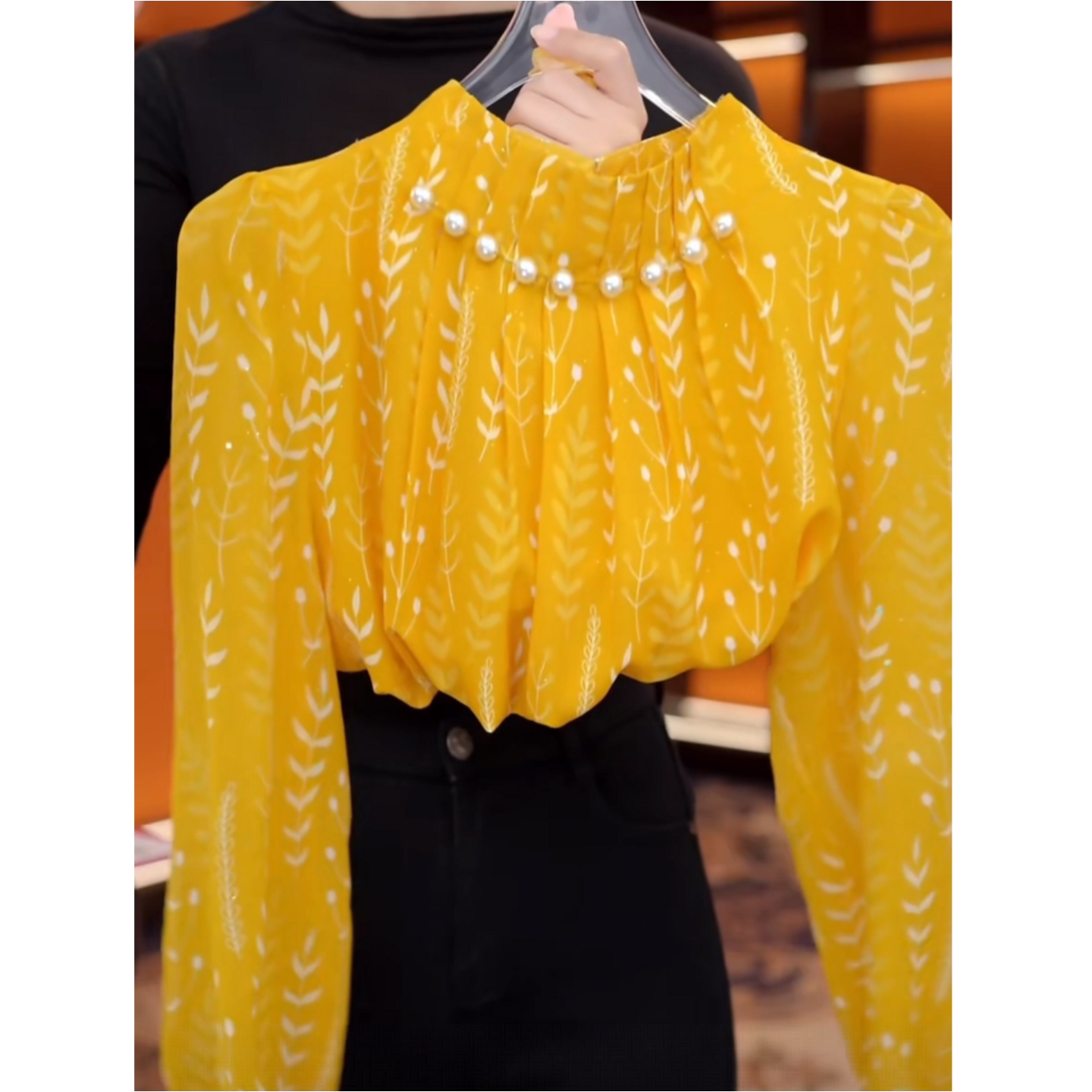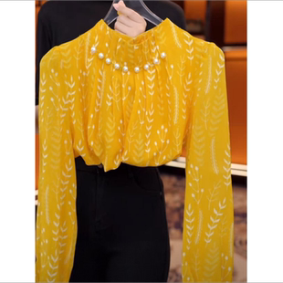 小衫 气质钉珠设计立领减龄百搭长袖 上衣 女秋季 高级感黄色印花衬衫