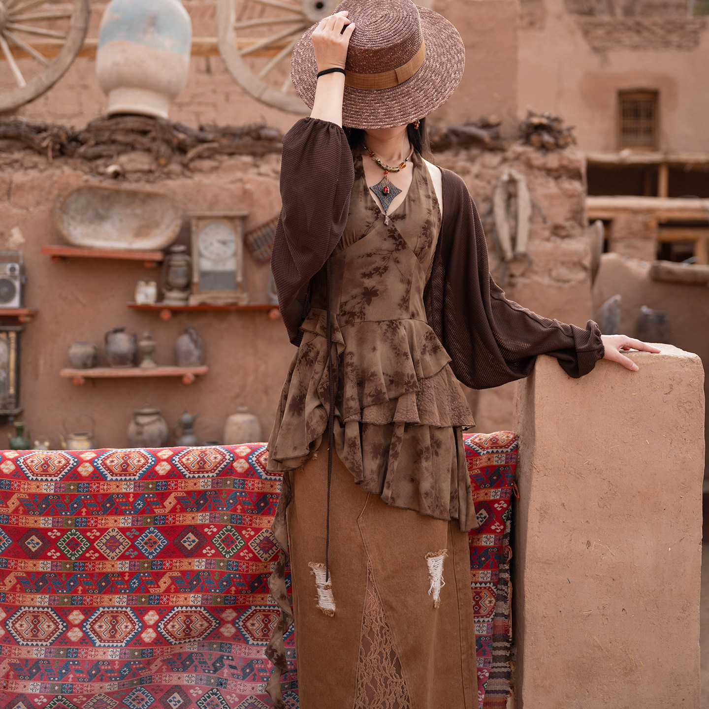 理想三旬女装 连衣裙 波西米亚废土风咖啡色荷叶边重工不规则短款