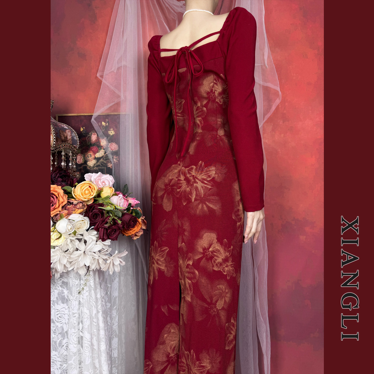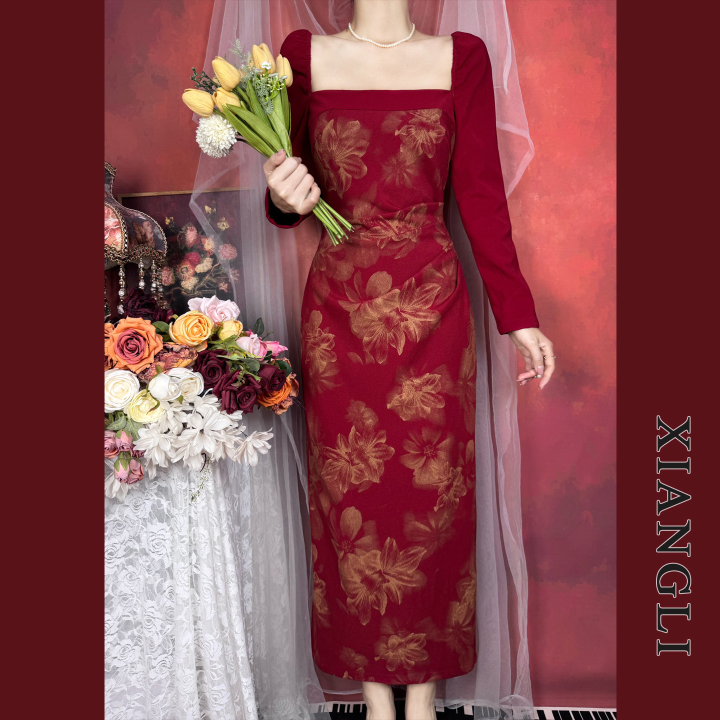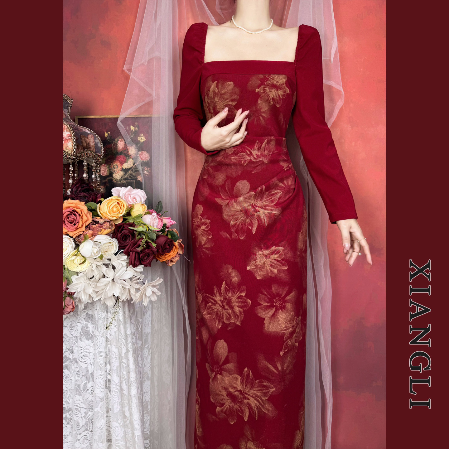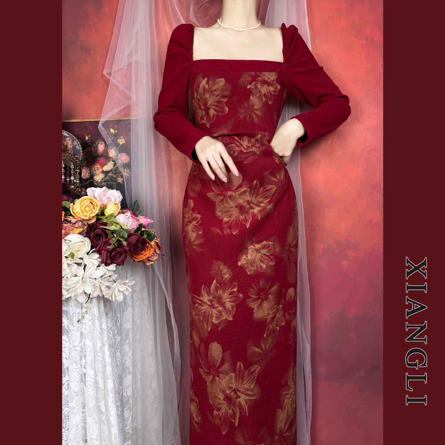 巷里法式 气质显瘦订婚敬酒新娘礼服 复古红色连衣裙女秋冬方领长袖