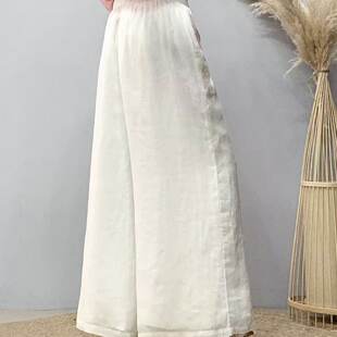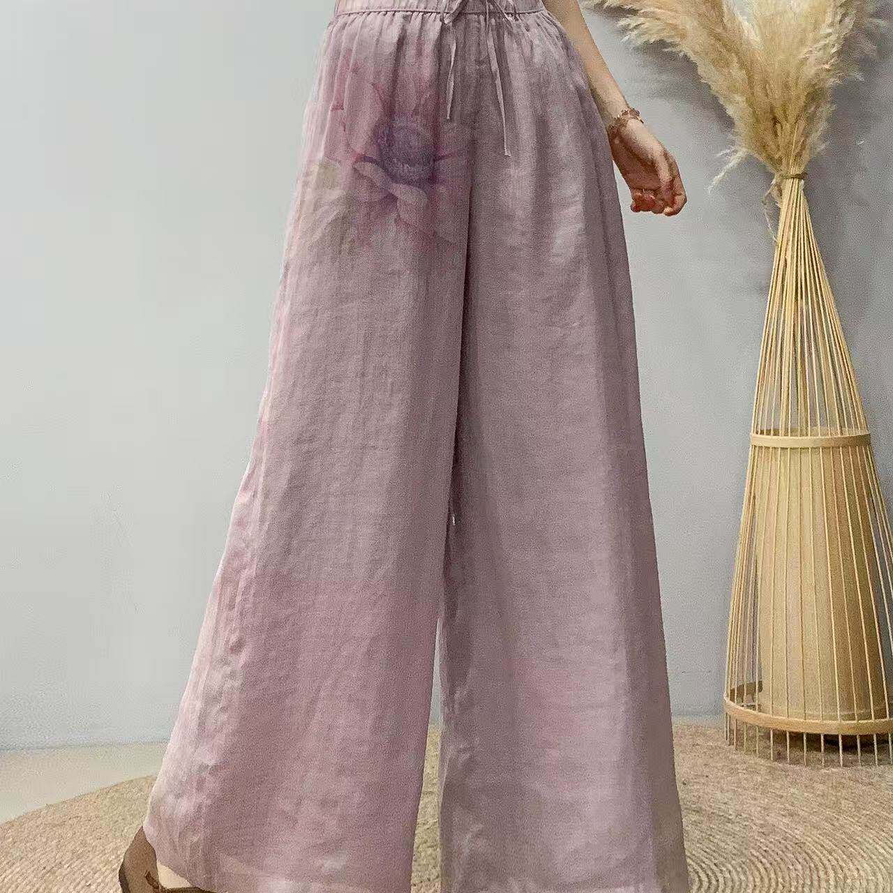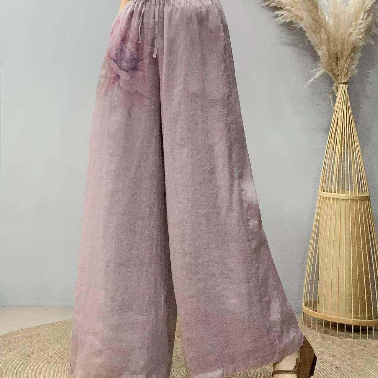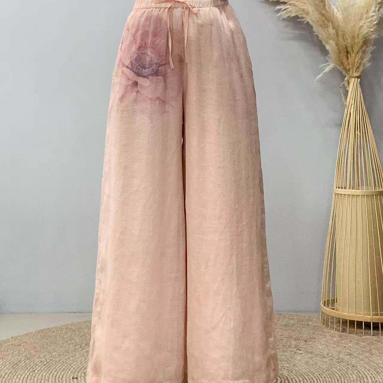 复古印花苎麻阔腿裤 休闲百搭 女松紧腰宽松系带九分裤